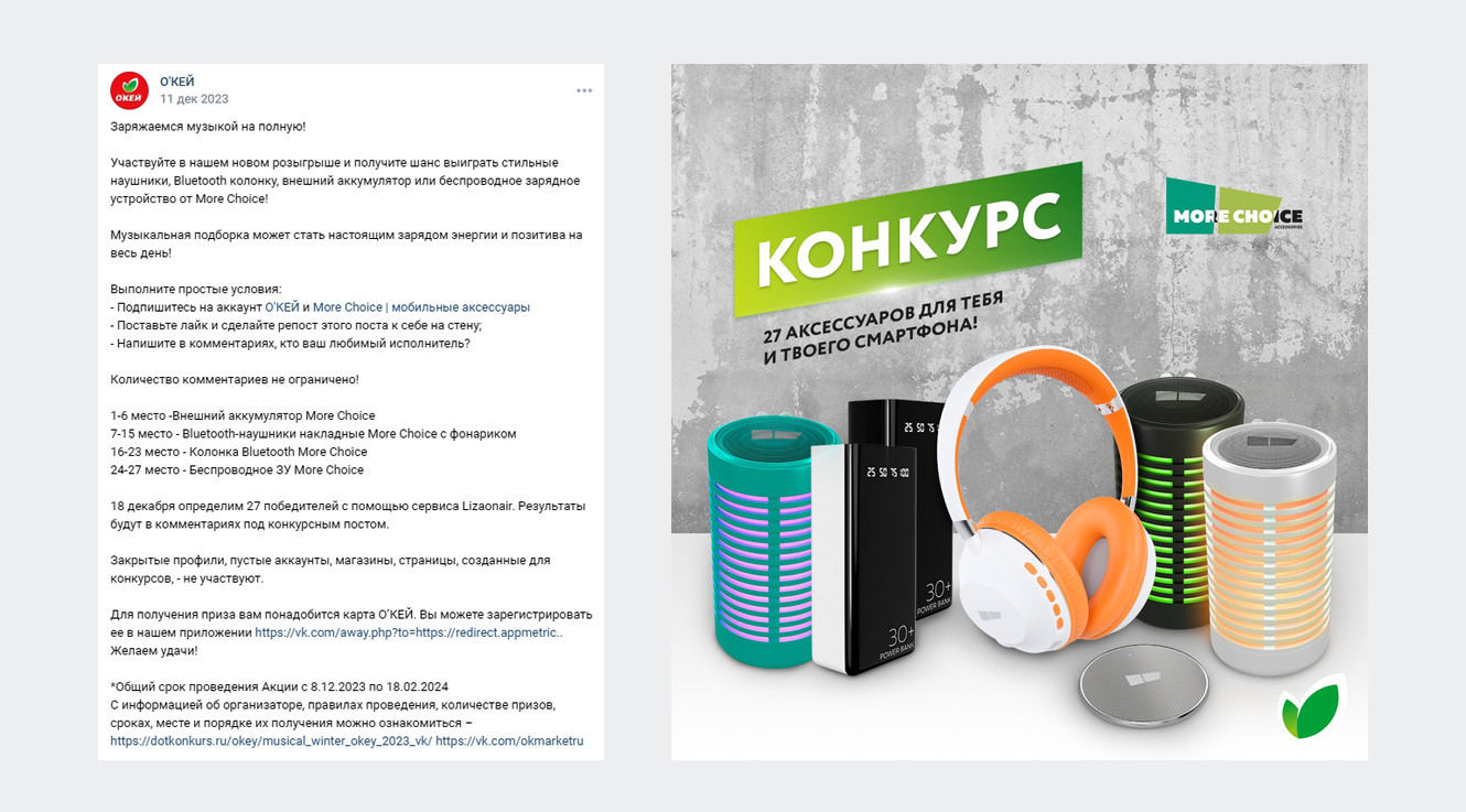3. Примеры рекламных текстов для социальных сетей. Прежде, чем организовать активность, нужно спрогнозировать, что интересно вашей ЦА. Возьмем в пример крупного ритейлера с большим количеством конкурсов — гипермаркеты О’КЕЙ. После анализа подписчиков сообщества, мы выяснили, что большинство из них — платежеспособные молодые женщины, в топе интересов которых помимо продуктов питания находятся: парфюмерия и косметика, товары для дома, одежда и обувь, ЗОЖ и т. д. Компании из этих сфер и будут нашими потенциальными партнерами в конкурсах! Но не стоит забывать, что мы искали партнеров для сети гипермаркетов, которая закрывает все эти потребности ЦА в себе. Соответственно, чтобы аудитория не перетекала к косвенным конкурентам, мы могли работать с поставщиками, чьи товары уже представлены на полках магазинов. Интересы Вашей аудитории ясны. Где же найти компании партнеров? Все настолько просто! Эта механика отлично работает, так как зачастую получатель сообщения напрямую заинтересован в развитии аккаунта бренда в соцсетях. Максимальное попадание в цель! После анализа отправьте персонализированные сообщения вашим потенциальным партнерам-поставщикам. Важно, каждое сообщение должно быть адаптировано под конкретного получателя, чтобы продемонстрировать, что участие будет взаимовыгодным. Оперативно отслеживайте ответы от партнеров и готовьтесь к предоставлению дополнительной информации или помощи, если это потребуется. Поддержка и обратная связь с партнерами помогут укрепить их интерес и вовлеченность даже если однозначного согласия на проведение конкурса вы сразу от них не получите. После рассылки сразу делайте таблицу, в которой указывайте название юридического лица, бренда, контакты ответственного лица (если есть), ссылку на сообщество и количество подписчиков — эти данные будут полезны вам в будущем. В социальных сетях О’КЕЙ проводилось от 4 до 8 партнерских конкурсов ежемесячно. Изначально мы сами инициировали такие проекты, предлагая сотрудничество представителям брендов по описанной выше механике. В настоящее время всё больше компаний, которые сами обращаются к нам, отмечая эффективность таких активностей: большое число участников, обширные охваты и высокие показатели ER. Давайте рассмотрим все вышесказанное на примере и сравним показатели конкурса с партнером и внутренним конкурсом с простой механикой: Партнерский конкурс: Внутренний конкурс: С сентября 2023 года в России действует закон о маркировке интернет-рекламы, который требует пометки рекламных постов и передачи данных о рекламодателях в единый реестр. Этот пункт важен, так как все посты с упоминанием брендов или призывами к подписке считаются рекламой и требуют отчетности. Есть элегантное решение: Шаг 1 — Заключаем с партнером договор № 1 на заказ им (партнером) рекламы в вашем сообществе. К примеру, цена 5 000₽. Шаг 2 — Заключаем договор № 2 на поставку призов со стороны партнера, стоимость которых совпадает с «Договором № 1», также 5 000₽. Шаг 3 — Делаем Акт взаимозачета, благодаря которому никакие деньги «не ходят» между счетами. Пользуясь этой схемой вы получаете главное — Акт на оказание рекламных услуг, в котором есть стоимость. Эту стоимость вы указываете в ОРД. Аналогичную «партию» договоров заключаете вы для своего юрлица. Ваш партнер тоже получает