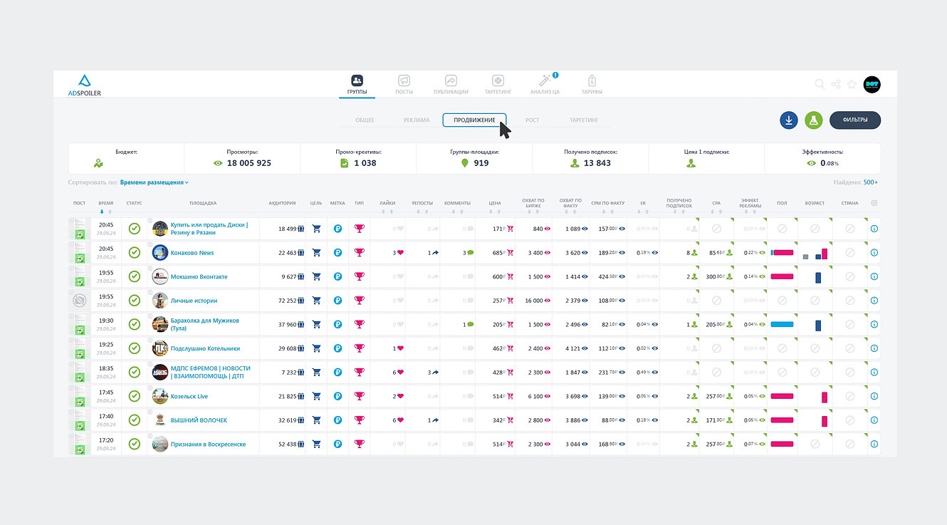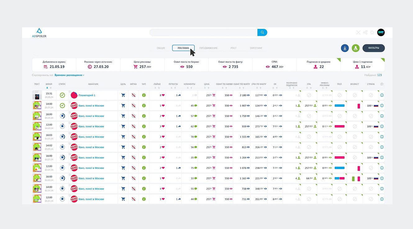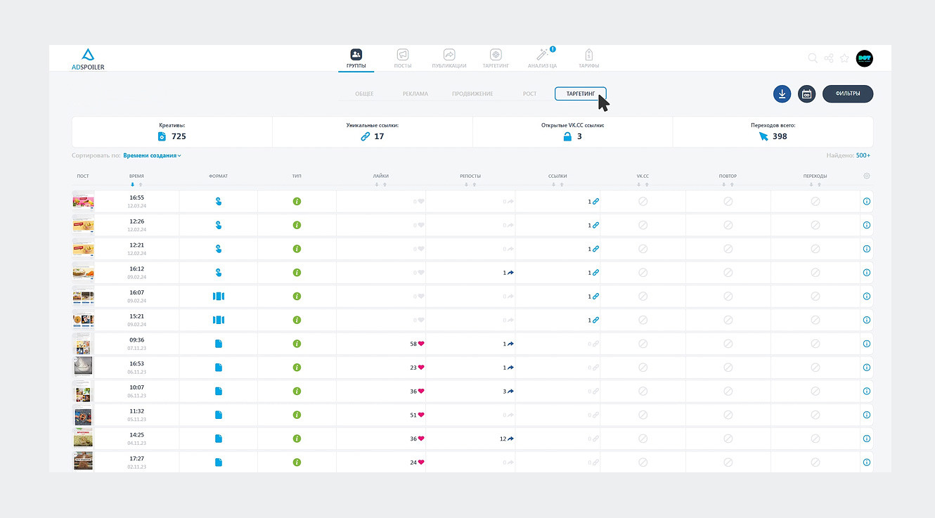 AdSpoiler — это универсальный сервис для анализа рекламы, размещенной в группах и сообществах ВКонтакте. Он позволяет отслеживать как количество и качество рекламных объявлений, так и сами креативы и рекламные форматы.
