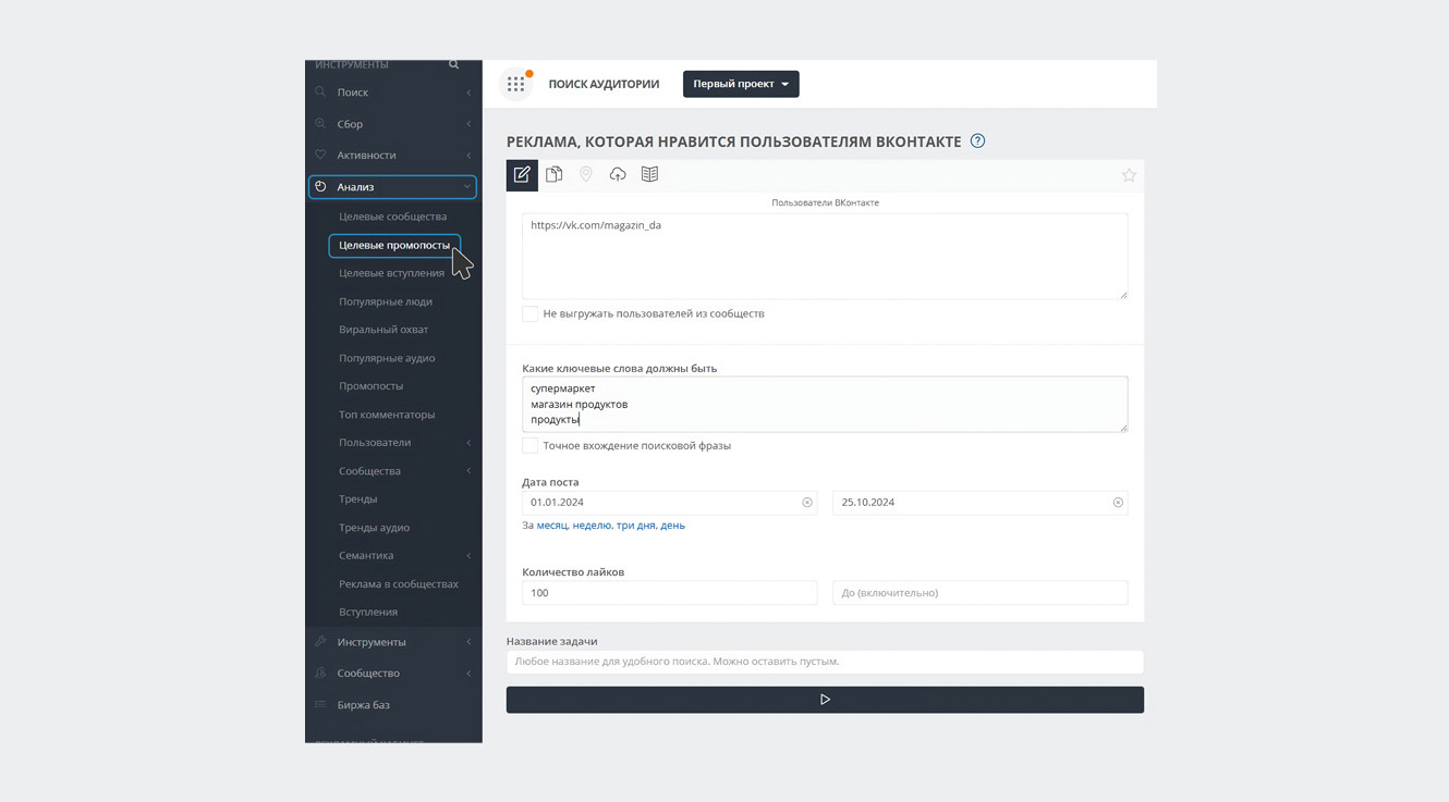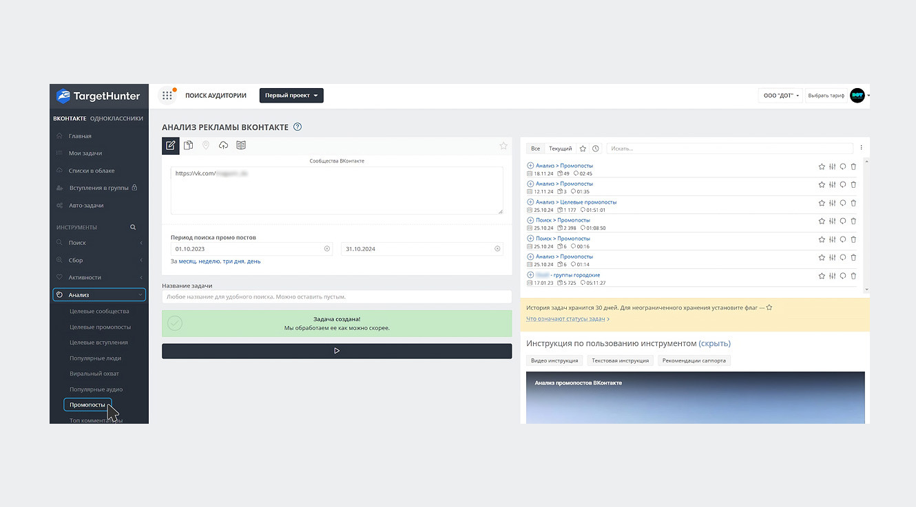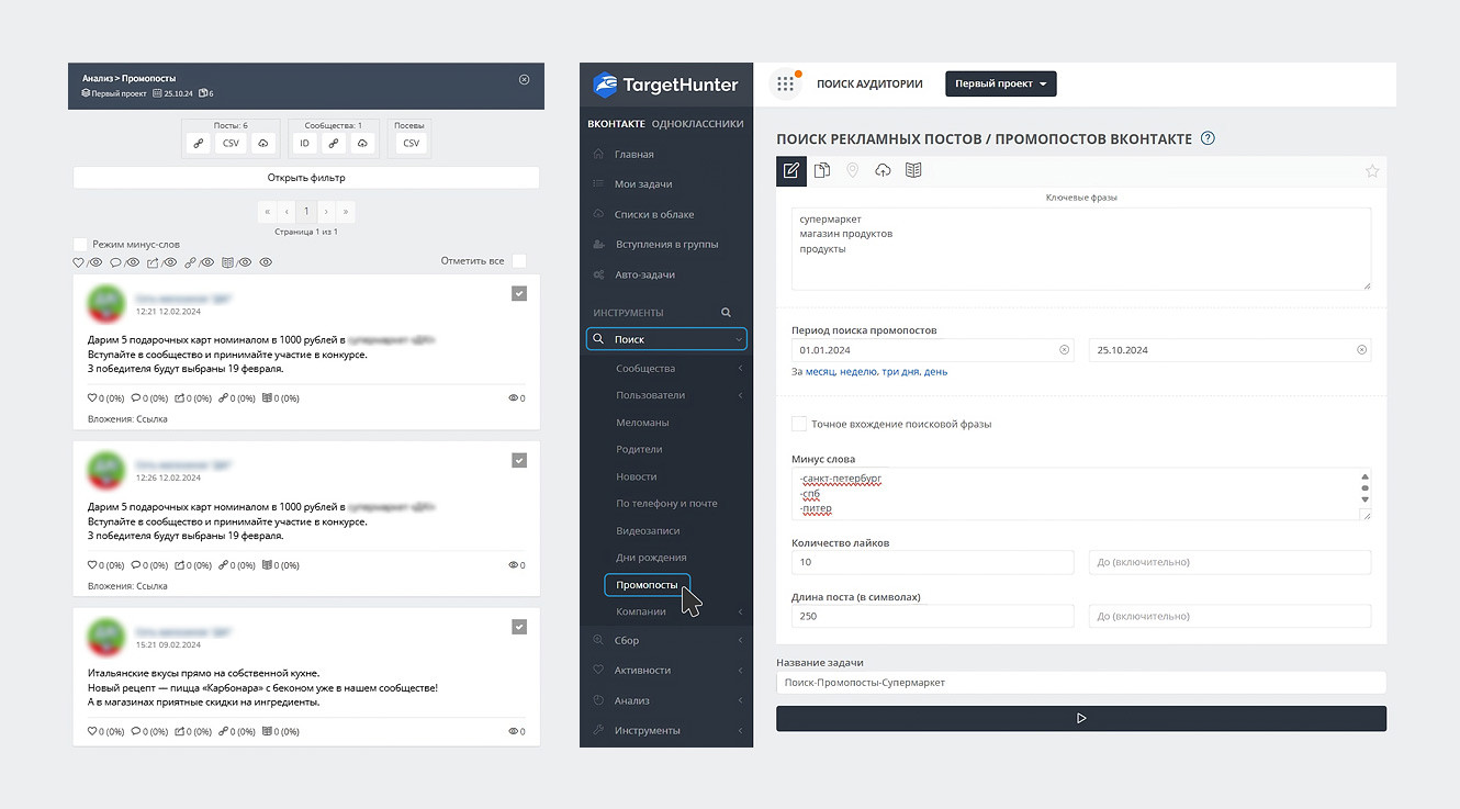 Вкладка «Реклама» показывает результаты по размещению посевов в данном сообществе. Вкладка «Продвижение» позволяет увидеть, какие сообщества ВКонтакте выбираются для посевов, а также какие записи продвигаются: рекламные, информационные, развлекательные или посты об акциях и спецпредложениях. Можно отсортировать публикации по времени, а также указать конкретный временной промежуток для аналитики. Здесь же можно увидеть затраты, охват и CPM продвигаемых записей, то есть стоимость за 1000 показов. Сервис при оплате Премиум-доступа отображает общую статистику продвигаемых записей за период, а также стоимость за одного подписчика. Либо можно вручную посчитать примерный CPF по приросту в сообществе и стоимости затрат на рекламу. Отсюда же можно по клику перейти на конкретную запись в ВКонтакте и просмотреть её, если она не удалена. Вкладка «Таргетинг» показывает, что рекламируют ваши конкуренты посредством таргетированной рекламы. Примечательно, что сервис фиксирует формат рекламы: универсальная запись, запись с кнопкой, карусель, сбор заявок, статья. Здесь же мы сможем увидеть, какой тип контента ставят на рекламу — акции или другую информацию. НЕДОСТАТКИ К сожалению, конкретный результат, который был получен в таргете по стоимости, количеству кликов, подписчиков или других целевых действий увидеть мы не сможем. Тем не менее, эта информация позволит нам понять приоритетные направления деятельности, проанализировать наиболее актуальные акции, и, возможно, вдохновиться на создание своих рекламных креативов, чтобы использовать лучшие практики или постараться отстроиться от конкурентов свежим подходом. НАИБОЛЬШАЯ ПОЛЕЗНОСТЬ Сервис помогает комплексно проанализировать рекламную активность сообщества ВКонтакте. Здесь можно увидеть, в каких пабликах делаются посевы, какие записи продвигаются с помощью таргетированной рекламы. Также можно проанализировать эффективность рекламы в том или ином сообществе, охваты и стоимость размещения, поэтому AdSpoiler может стать помощником в подборе сообществ для посевов и отслеживании статистики их размещения. TargetHunter — известный парсер, который также подходит для мониторинга рекламы конкурентов в ВКонтакте. Далее расскажем о сильных и слабых сторонах функционала. ВОЗМОЖНОСТИ Для отслеживания промопостов в TargetHunter есть три инструмента, однако собрать данные возможно только из рекламных кабинетов ВКонтакте старого образца, то есть по VK Рекламе из новых кабинетов сервис собрать данные не сможет. Также не отслеживается какая-либо информация по посевам в других сообществах. Теперь о каждом способе подробнее. Способ 1: «Анализ — Промопосты» — позволяет найти промопосты конкурентов. Инструмент доступен даже с бесплатным доступом, но в таком случае мы сможем загрузить только 10 последних промопостов. Для сбора данных необходимо ввести ссылки на сообщества, рекламные промопосты в которых мы планируем анализировать. Затем указываем интересующий временной интервал. Можно выбрать один из предложенных стандартных периодов (1 день, 3 дня, неделя, месяц) или задать конкретные даты вручную. Можно ввести название для этой задачи, чтобы дальше было проще ориентироваться в полученных данных. Буквально пара кликов и справа появятся данные, которые мы сможем проанализировать. Все собранные данные буд
