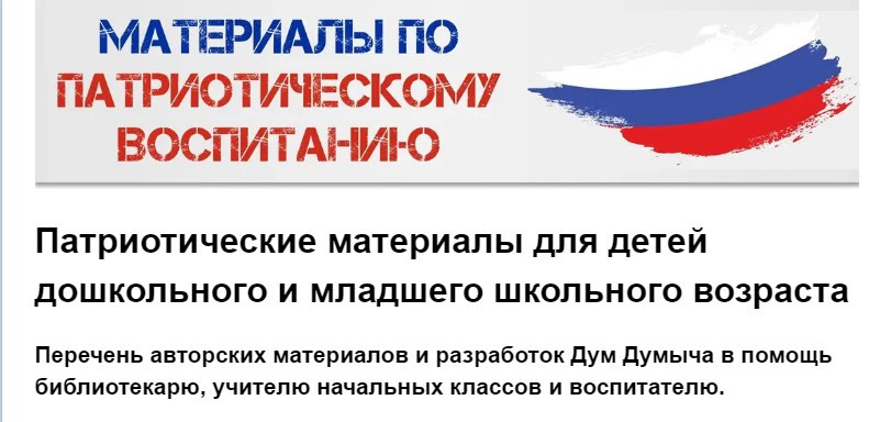 В частности, для ДОУ и начальных школ нами подготовлена целевая страница с подборкой большого количества разнообразных материалов и разработок патриотического направления.