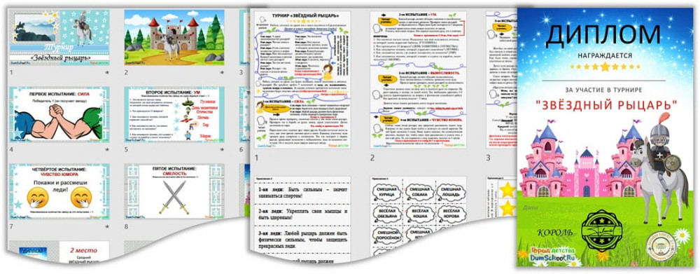 В зависимости от количества полученных звезд каждый участник получит один из Дипломов, входящих в комплект разработки. А состоит она из двух файлов: презентация, её можно (но не обязательно) использовать для сопровождения мероприятия и pdf-файл из 10 страниц, в нём сценарий мероприятия (на 3 страницы) и все приложения к турниру (полный комплект к распечатке). Рыцарский турнир можно провести в школе или библиотеке.