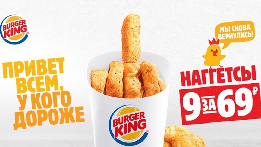 Похожую стратегию выбрал для себя и российское подразделение Burger King, которое весь прошлый год выпускала двусмысленные принты: