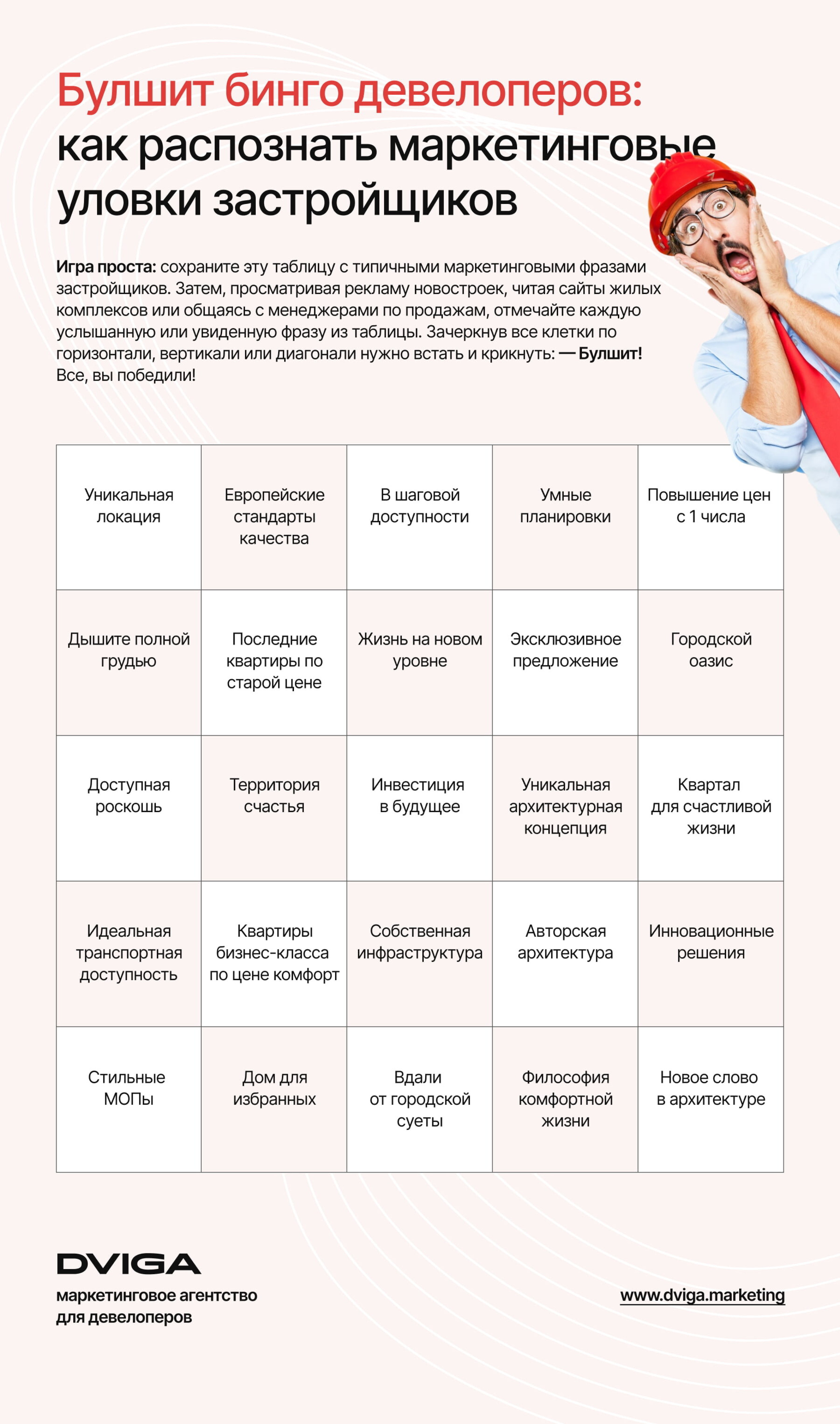 Почему застройщики и девелоперы так любят использовать громкие, но малосодержательные фразы? Причина проста — эмоциональная составляющая играет огромную роль при покупке жилья. Квартира — это не просто квадратные метры, а место, где человек будет жить, отдыхать, воспитывать детей, встречать гостей. Маркетологи умело играют на этом, создавая образ идеального дома, где реализуются все мечты о комфортной жизни. Проблема в том, что за красивыми словами часто скрывается обычный типовой проект, а «уникальные» преимущества на поверку оказываются стандартными характеристиками любого современного жилья. Умение распознавать такие уловки поможет вам трезво оценить предложение и сделать осознанный выбор при покупке недвижимости. Игра проста: сохраните эту таблицу с типичными маркетинговыми фразами и УТП застройщиков. Затем, просматривая рекламу новостроек, читая сайты жилых комплексов или общаясь с менеджерами по продажам, отмечайте каждую услышанную или увиденную фразу из таблицы. Зачеркнув все клетки по горизонтали, вертикали или диагонали нужно встать и крикнуть: — Булшит! Все, вы победили! Приз — снижение ставки по ипотеке на 3%. Безусловно, это шуточная игра, но с серьезным подтекстом: она помогает развить критическое мышление и научиться видеть реальность за маркетинговыми обещаниями. Вот 25 типичных УТП, которые часто используются в маркетинге недвижимости: Многие из этих фраз звучат впечатляюще, но что они означают на самом деле? Чтобы не попасться на маркетинговые уловки, обращайте внимание на конкретику вместо расплывчатых обещаний: Булшит бинго — это не просто развлечение, а инструмент (чек-лист), который поможет вам стать более осознанным потребителем и не поддаваться на эмоциональные маркетинговые приманки при выборе вашего будущего дома. Современный покупатель становится всё более информированным и критичным к рекламным сообщениям. Для застройщиков сегодня важно не просто привлечь внимание, а построить отношения с аудиторией, основанные на доверии и честности. Честная коммуникация в маркетинге девелопмента — это не только этичный подход, но и стратегически верное решение, потому что она укрепляет репутацию компании, снижает стоимость привлечения клиентов и увеличивает количество рекомендаций в будущем. Как руководитель, специализирующийся на маркетинге в сфере девелопмента, я помогаю застройщикам находить настоящие конкурентные преимущества, формировать запоминающиеся бренды и выстраивать стратегию, которая действительно работает. Если вы ищете партнёра, который понимает рынок и говорит с аудиторией на одном языке, посмотрите, как мы подходим к задачам комплексного маркетинга.