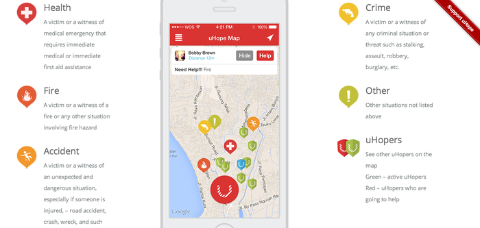 Возможно ваши друзья и родные будут слишком далеко чтобы помочь вам немедленно. В этом случае приложение Uhope отправит sms сообщение всем пользователям приложения в радиусе 5 км. Пользователи получившие сигнал о помощи видят геоположение потерпевшего на карте, контакты для экстренной связи, маршрут. Волонтеры в реальном времени видят на карте, где в данный момент уже находится помощь и кто спешит на помощь.