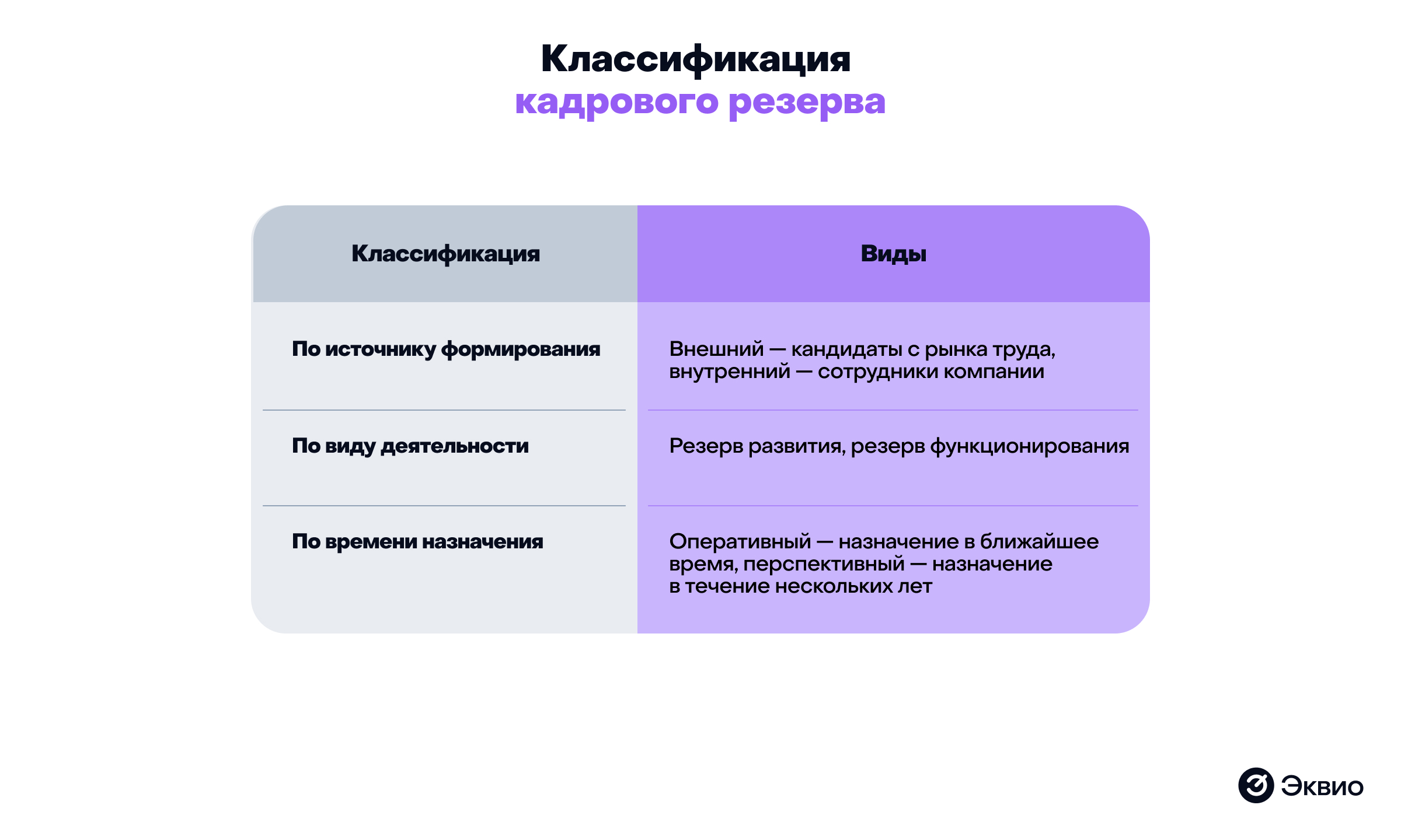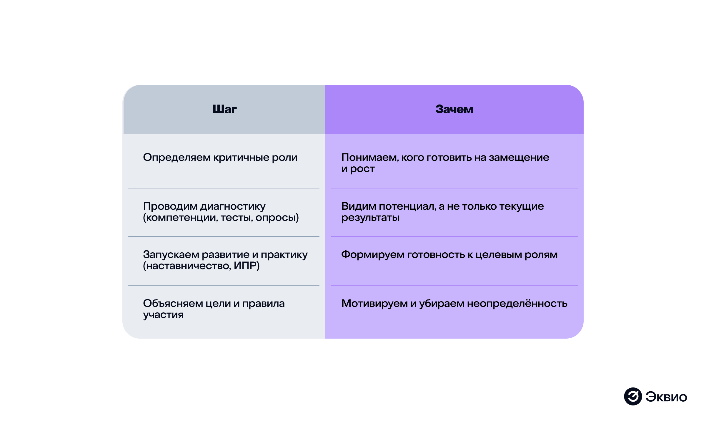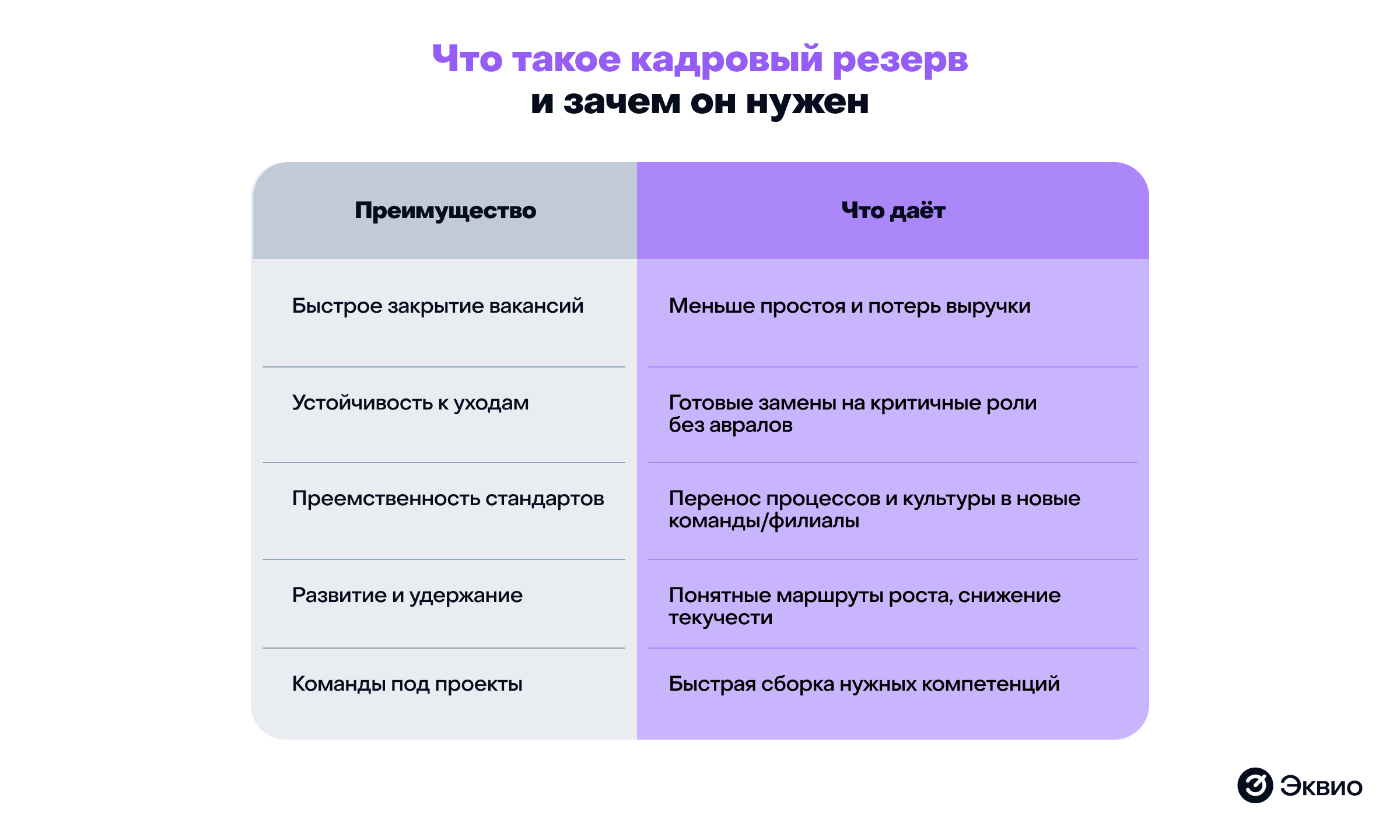 Кадровый резерв — это актуальная база людей, к которым компания обращается в первую очередь при открытии вакансии: действующие сотрудники с потенциалом, финалисты прошлых конкурсов, бывшие сотрудники и подходящие соискатели.