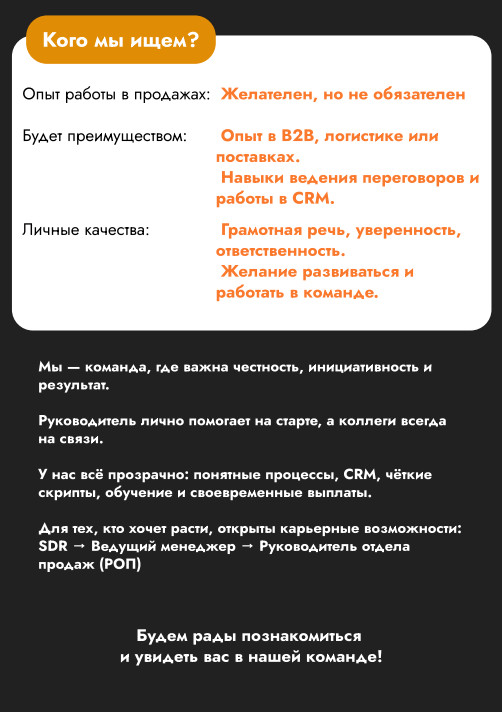Для этой роли не был критичен опыт именно в логистике. Нам были важны навыки телефонных переговоров, опыт холодных звонков или B2B-продаж и готовность работать с клиентскими базами.