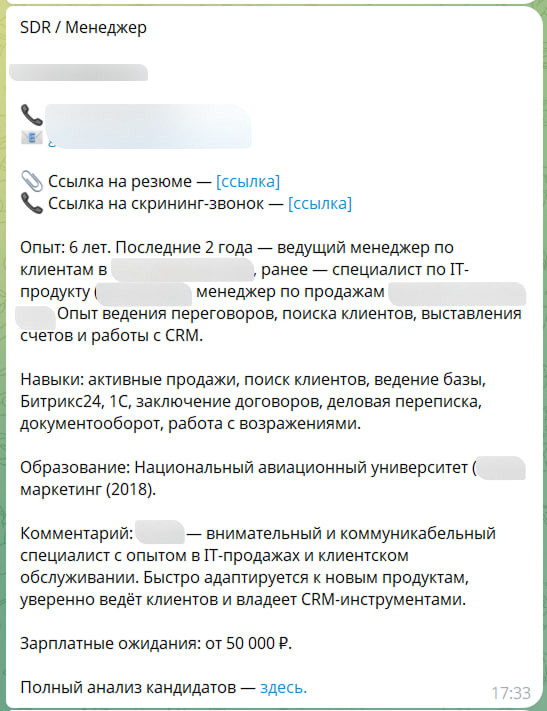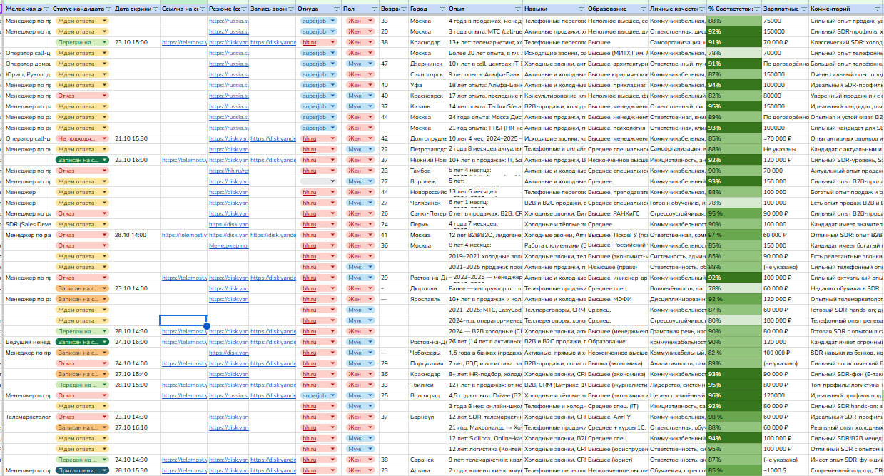 После этого можно было запускать поиск. Поиск кандидатов шел сразу по нескольким каналам. Мы разместили вакансию на hh.ru, приобрели базу кандидатов на SuperJob и начали активный ресерч. Параллельно создали рабочий Telegram-чат с клиентом, где ежедневно публиковали отчеты по проекту. Это позволило клиенту видеть динамику проекта практически в реальном времени. За время проекта мы просмотрели 680 резюме. Из них 86 кандидатов прошли первичный фильтр и были признаны релевантными для позиции SDR. После переписки и уточнений 36 человек согласились пройти первичный скрининг. На этом этапе мы проверяли опыт продаж, навыки коммуникации и готовность работать с холодными звонками. Всего было проведено 21 скрининг-интервью. По итогам этих интервью 19 кандидатов были переданы заказчику на финальные собеседования. Следующий этап проходил уже вместе с клиентом. Мы организовали 15 собеседований через Яндекс.Телемост. Для каждого кандидата готовили карточку: резюме, краткий анализ и запись скрининг-интервью. Это сильно экономило время собственника. Ему не нужно было заново разбираться в кандидатах: вся информация уже была собрана и структурирована. По результатам интервью 8 кандидатов получили приглашение на обучение, а 5 человек подтвердили участие и приступили к обучению. Среди них были специалисты с опытом телемаркетинга, B2B-продаж, работы в call-центрах и клиентском сервисе. Такой состав позволил клиенту сформировать базовую команду для будущего отдела продаж. Проект занял 8 дней: с 20 по 28 октября 2025 года. При этом плановые показатели были выполнены с превышением. Мы нашли 86 релевантных кандидатов вместо запланированных 40.Организовали 15 собеседований вместо 10.И подготовили 5 кандидатов к обучению и работе. Кроме самих кандидатов клиент получил готовую структуру процесса подбора: таблицу аналитики, записи интервью, комментарии по кандидатам и понятную систему отбора. Фактически вместе с кандидатами мы передали и готовую воронку найма, которую можно использовать дальше. После завершения проекта собственник написал нам короткое сообщение: "Очень и очень оперативно сработано! Структура и подача результата — отлично. Все понятно, по полочкам, без воды. Благодарю за работу. Иногда кажется, что главная проблема найма — найти людей, но чаще проблема в другом. Нет структуры процесса: где искать кандидатов, как их фильтровать, как проводить интервью и как принимать решения. Когда эта система появляется, подбор начинает работать гораздо быстрее. *** Если вам интересны темы делегирования задач, операционного управления и выстраивания процессов или если у вас похожая задача, например, нужно быстро собрать команду или наладить процессы внутри бизнеса — можно написать мне в Telegram:https://t.me/sosshklv