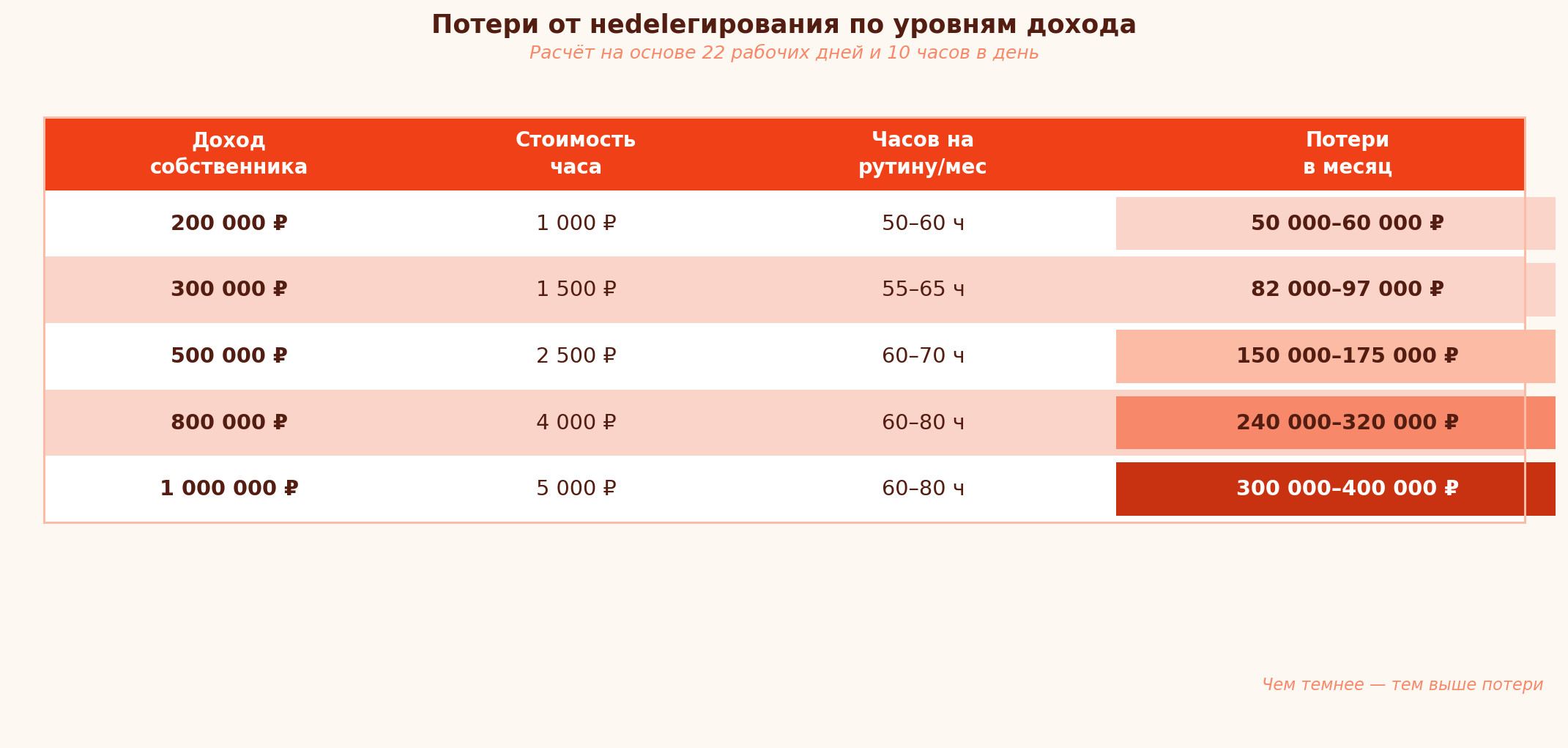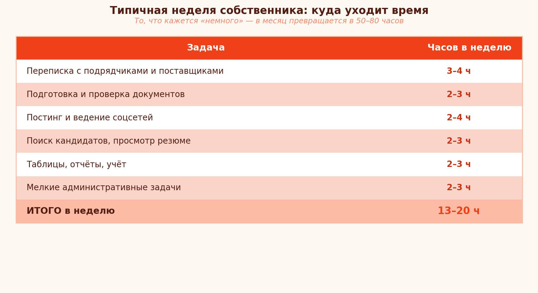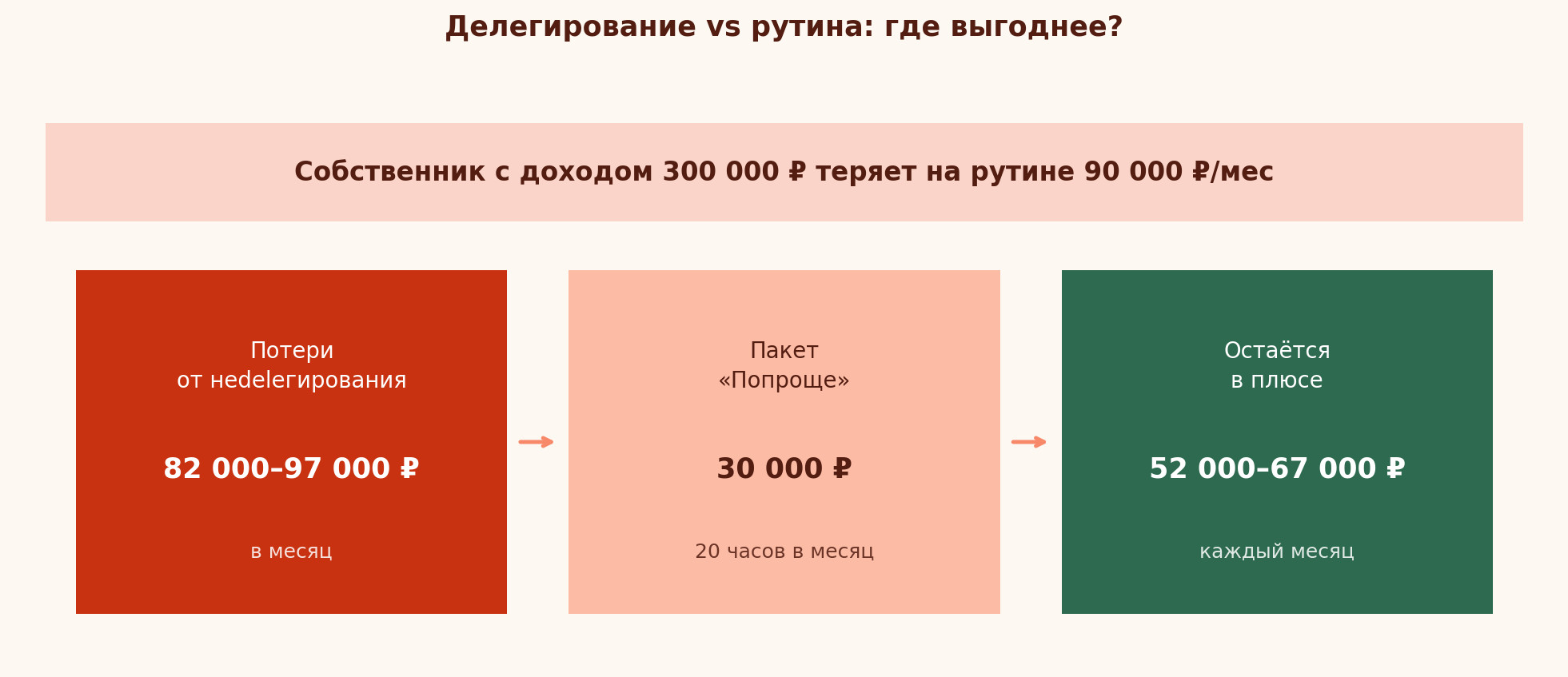 Вот типичная неделя собственника, которого мы видим на старте работы: Возьмем консервативно — 15 часов в неделю. Это меньше двух рабочих дней. Звучит не страшно. Но в месяц это 60 часов. 60 часов × 1 500 рублей = 90 000 рублей в месяц. Это деньги, которые собственник с доходом 300 000 рублей тратит на задачи, которые стоят 300–500 рублей в час на рынке. А теперь давайте возьмем реальную картину, не консервативную. Это не выдуманные цифры. Это реальный диапазон того, что мы видим у клиентов на старте. Деньги — это только видимая часть потерь. Есть еще три, которые не считают почти никогда. Стоимость задержки. Пока собственник разбирался с таблицами, он не позвонил потенциальному клиенту. Пока готовил презентацию — не провел стратегическую встречу. Каждый час рутины — это час, который мог стоить гораздо дороже, чем показывает расчет выше. Стоимость ошибок от усталости. Человек, который делает операционку в конце напряженного дня, делает ее хуже. Ошибки в документах, задержки в ответах, упущенные детали — это реальные деньги, которые сложно посчитать, но легко почувствовать. Стоимость выгорания. Это самая дорогая статья расходов, у которой нет формулы. Когда собственник делает все сам — он устает не от сложных задач, а от мелких. И именно это убивает энергию на развитие. Давайте сравним с конкретными цифрами. Наш базовый пакет — 30 000 рублей в месяц за 20 часов работы команды. Это закрывает примерно 10–15 типовых задач: документы, переписка, выкладка контента, таблицы, поиск подрядчиков. Для собственника с доходом 300 000 рублей: Даже если взять самый дорогой пакет на 80 000 рублей — собственник с доходом от 500 000 рублей выходит в плюс уже в первый месяц. Я сделала простой калькулятор: введите свои цифры и получите результат за 30 секунд. Три поля: доход в месяц, рабочих часов в день, процент времени на рутину. На выходе — ваши потери в рублях и сравнение со стоимостью делегирования. Потому что рутина незаметна. Она не приходит как один большой счет — она приходит по 20 минут здесь, по полчаса там. Мозг не воспринимает это как потерю. Он воспринимает это как работу. Но работа собственника — это не отчеты и не переписка с поставщиками. Работа собственника — это решения, отношения и рост. Все остальное можно передать. Вопрос только в том, когда вы решитесь это посчитать. *** Если хотите разобрать свою ситуацию — напишите мне напрямую. Первый разговор бесплатный, и обычно уже на нем становится понятно, где теряется больше всего времени. Подписывайтесь на наш Telegram-канал Вместе проще — там кейсы, инструменты и честно про операционку.