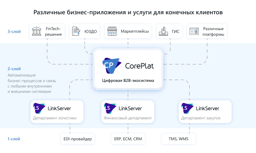 CorePlat и LinkServer соединяют внутренние системы (первый слой на схеме) с внешними (второй