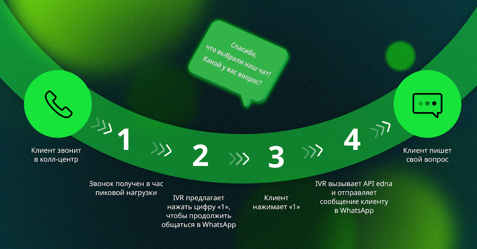 «Приходит звонок в колл-центр от клиента, и чтобы он не ждал ответа оператора на линии, голосовое меню предлагаем ему задать свой вопрос в канале WhatsApp. При подтверждении перехода IVR вызывает API edna. Система проверяет есть ли клиент в WhatsApp и отправляет ему сообщение от официального бизнес-аккаунта компании, а звонок завершается. Если номера клиента нет в WhatsApp система сообщает об этом IVR и звонок продолжается» — объясняет Николай Ванд, руководитель направления Instant Messaging в компании edna.