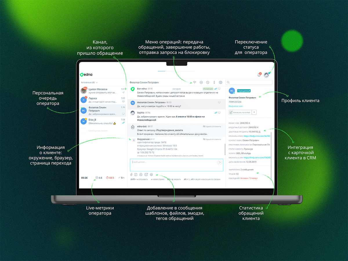 Далее предстояло внедрить чат-центр edna — системное решение для обработки всех входящих обращений клиентов. Работы начались весной 2021 года, и уже в конце года передали этот проект на поддержку.