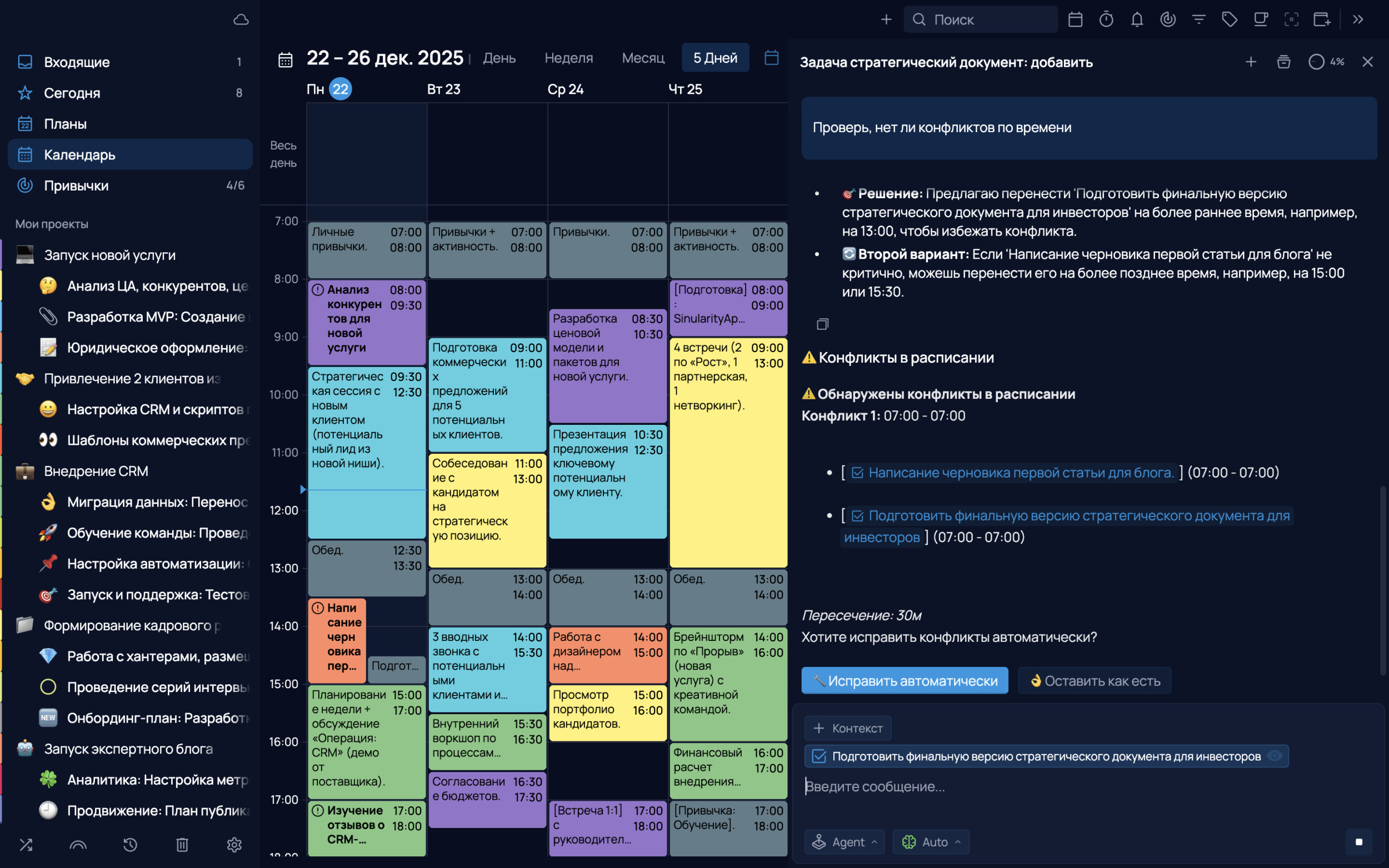 AI-ассистент интегрирован в саму логику сервиса. Это позволяет ему напрямую работать с пользовательскими задачами, дедлайнами, опытом и шаблонами. Инструмент обрабатывает данные пользователя и опирается на них для формирования ответов и рекомендаций, а не просто выполняет роль чат-бота на базе нейросети. Кроме того, в числе интересных решений — возможность выстраивать расписания с учетом уже запланированных событий и устранения пробелов во временных слотах. Особенностью решения стало то, что пользователи могут выбирать провайдера искусственного интеллекта самостоятельно. Поддерживаются как международные (OpenAI, Anthropic), так и российские решения — GigaChat от Сбера, YandexGPT и Ollama. Это позволяет адаптировать использование AI под технические и финансовые запросы. «Нам было важно, чтобы пользователи могли подключать не только зарубежных провайдеров с громким именем, но и популярные быстро развивающиеся модели российских нейросетей. Поэтому мы сделали возможность подключать Sber GigaChat и Yandex GPT. Их можно подключить в ПК-версии нашего приложения (Windows, Linux, MacOS)», — отмечает директор по продукту, Мамонтова Екатерина. AI-ассистент работает в двух основных сценариях. Первый — режим Ask: пользователь взаимодействует с ассистентом в формате диалога, задает вопросы по проектам, получает помощь с генерацией идей и оптимизацией расписания. Второй — режим Agent: система анализирует задачи, предлагает их структурирование, рассчитывает загруженность, находит пробелы в расписании и формирует план на день или неделю. На сегодняшний день, сервис нацелен в первую очередь на персональную работу внутри одного аккаунта. Однако можно работать и группами до 10 человек. В следующем году в SingularityApp планируют сосредоточиться на развитии возможностей именно для командной работы. "Контроль в любом случае всегда остается за человеком, как и принятие решений. Нейросети не заменяют способность думать и не снимают ответственность. Но то, как они уже сейчас могут помочь с рутиной — это очень хороший уровень. Со временем модели будут умнеть, результаты ответов будут становиться все точнее. Некоторые люди боятся такого прогресса и видят в этом опасность. Мы видим в этом новые возможности для каждого", — резюмирует CEO продукта, Владимир Завертайлов В условиях, когда значительная часть цифрового пространства привлекает внимание к потенциальным рискам внедрения ИИ, SingularityApp делает ставку на прикладное применение нейросетей в понятных сценариях, при сохранении прозрачности и контроля за решениями, принимаемыми человеком.