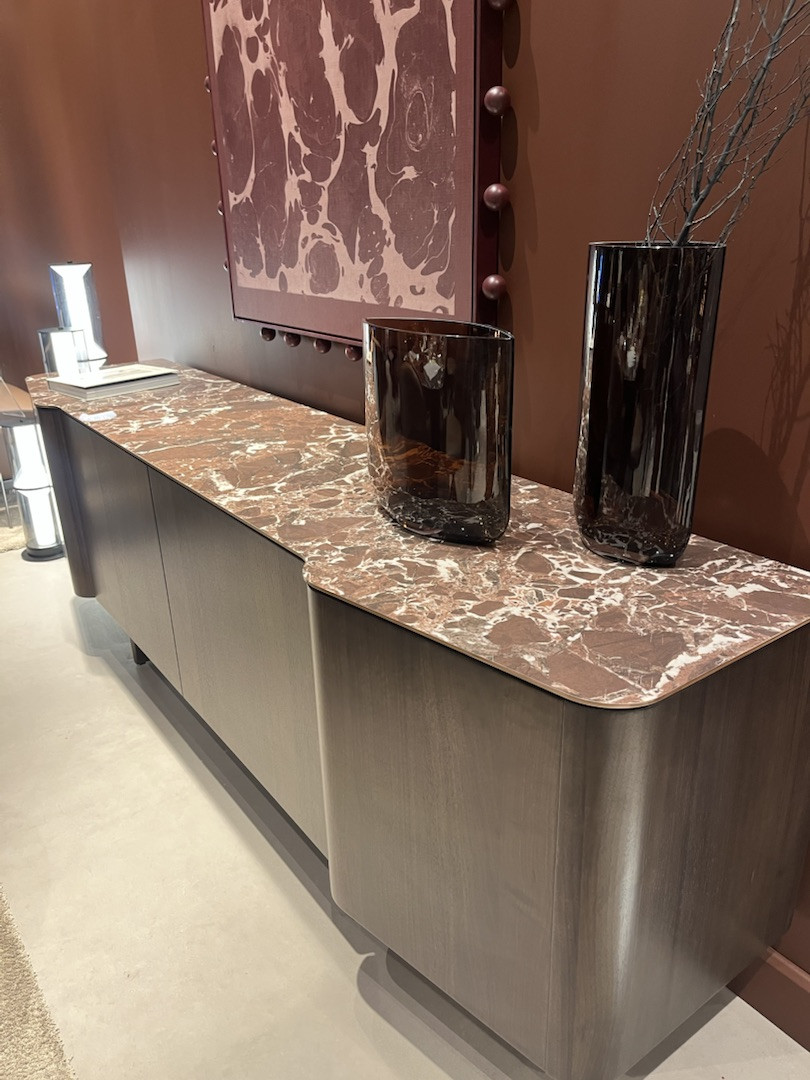 Дерево звучит по-новому: венге применяется уверенно, а американский орех остается универсальной классикой. Появился черно-бело-серый шпон с абстрактным рисунком — графичный и характерный. В камне акцент смещается к теплому цветному мрамору и травертину.
