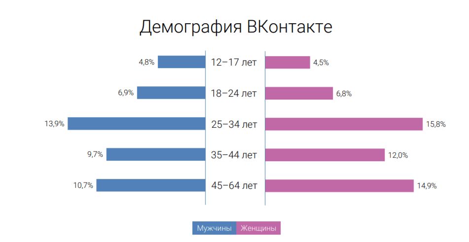 Ядро аудитории ВКонтакте — женщины и мужчины от 25 до 34 лет: