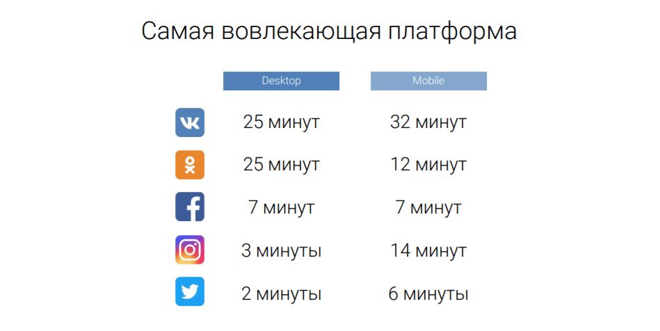ВКонтакте — самая вовлекающая платформа Рунета. Пользователи проводят во ВКонтакте 25 минут в день с десктопных устройств и 32 минуты — с мобильных.