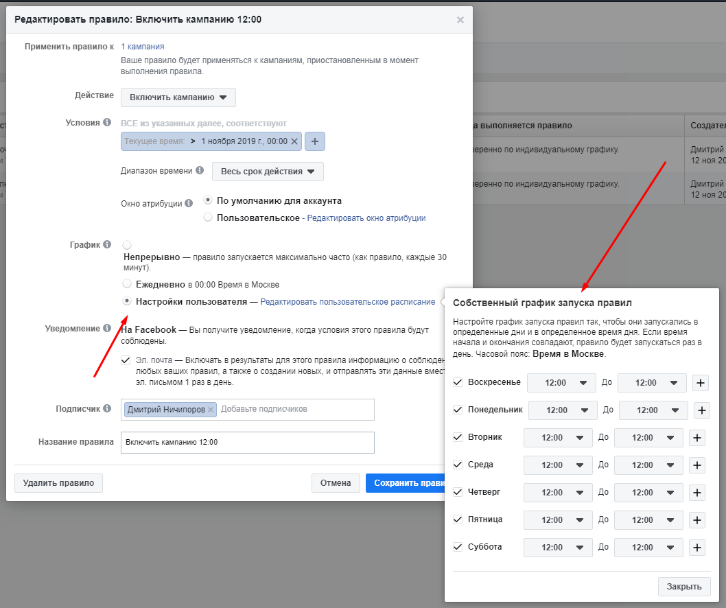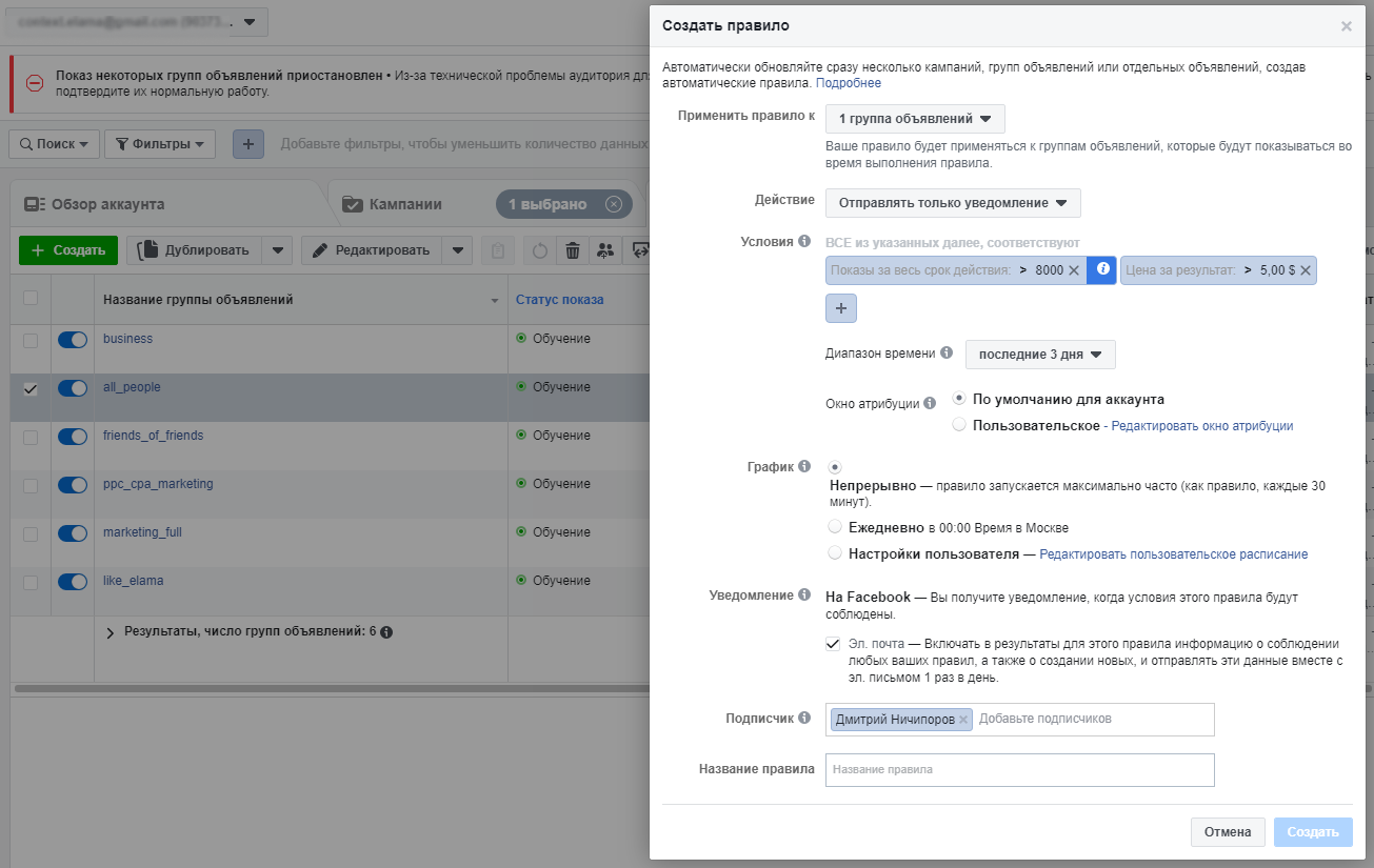 Выбираем кампанию (или несколько), к которой хотим применить правило. Нажимаем «Создать правило». Нам открывается меню. Выбираем действие «Включить кампанию». Я выбрал временное условие «Текущее время > 1 ноября 00:00», что позволяет сделать выполнение правила обязательным и постоянным. Далее выбираем собственный график запуска правил и проставляем на каждый день недели время запуска правила. Называем правило и нажимаем «Сохранить». Мы настроили правило для включения кампании, но это только половина работы — нужно еще правило для выключения. Проделываем все те же манипуляции, но меняем действие на «Выключить» и выставляем график. Правила настроены: теперь рекламные кампании будут включаться каждый день в 12:00 и выключаться в 18:00. Важно оперативно реагировать на изменения эффективности рекламных кампаний, поэтому специалисты по рекламе в Facebook чаще всего настраивают правила на отправку уведомлений при изменении цены за конверсию. Покажу на примере групп объявлений. Чтобы избежать выгорания аудитории, специалисты настраивают правило на частоту показов. Пользователи, которые видели рекламу более трех раз, с меньшей вероятностью кликнут по объявлению: если они не сделали этого ранее, то, скорее всего, оно просто их не интересует. Чтобы не сливать бюджет в уже выгоревший креатив, объявление стоит выключить. А с помощью правила можно автоматизировать этот процесс. Мы разобрали основные правила для автоматизированной работы с Facebook Ads. Инструмент правил позволяет работать с большим количеством различных сущностей и переменных. При желании можно создать более сложную систему конкретно под ваши задачи. 28 января состоится бесплатный вебинар eLama «Как получить больше конверсий с Google Ads». Регистрируйтесь, чтобы узнать, как работать с таргетингами, площадками, форматами рекламы и стратегиями назначения ставок.