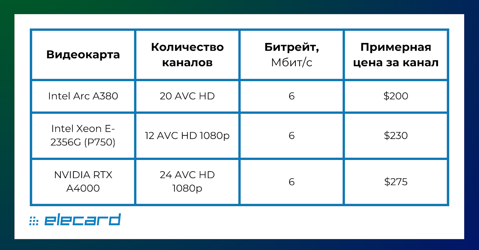 Для сжатия SDI-сигнала используются: При выборе карты захвата важно учитывать: ✔ Совместимость с операционной системой (Windows/Linux/macOS); Также при реализации проекта могут возникнуть проблемы с поставкой и тех. поддержкой карт захвата от иностранных поставщиков в России. В связи с этим рекомендуем обратить внимание на отечественные решения. Для сжатия SDI-сигнала в AVC/H.264, HEVC/H.265 или MPEG-2 понадобится энкодер. Мы рекомендуем Elecard CodecWorks как одно из самых передовых решений для кодирования и мультиплексирования видео. Существуют также сопоставимые по функционалу зарубежные альтернативы. Стоимость сжатия SDI-сигнала зависит от выбранного метода сжатия и мощности оборудования. Сжать SDI можно с помощью CPU (центральных процессоров) или GPU (графических процессоров). Процессорное кодирование позволяет гибко подходить к выбору платформы. Можно подобрать платформу и на 4 ядра и на 128 ядер, соответственно на 1 или 32 канала кодирования. В качестве примера возьмём приблизительный расчёт стоимости кодирования на процессоре Intel Xeon Silver 4510. Цена за сервер Supermicro с 2 процессорами с необходимым объёмом памяти и прочим в РФ будет стоить около $9000. При расчёте на 16 или 8 каналов: Использование видеокарт значительно снижает стоимость кодирования, но имеет некоторые аппаратные ограничения параметров кодирования (например, кодирование на большинстве доступных карт Nvidia не поддерживает интерлейсинг). Так, кодирование на Intel Arc A380 очень доступно и по цене, и по логистике (A380 можно купить даже в магазинах потребительской техники). Сравним популярные варианты сжатия по стандарту AVC в таблице: Таким образом, сжатие SDI-сигнала необходимо для более эффективного распространения контента. Оно позволяет передавать видео на неограниченные расстояния и кратно снижает битрейт. Для кодирования SDI необходимы карта захвата SDI, сервер для кодирования и энкодер. GPU-кодирование является менее затратным, чем кодирование на CPU, но его стабильность немного ниже. Упомянем также, что современные технологии позволяют передавать полный SDI-сигнал по IP с помощью SMPTE 2110. Это снижает затраты на передачу между студиями и продакшн-центрами. В последнем релизе Elecard CodecWorks доступна интеграция SMPTE 2110. 👀 Узнайте подробнее, как работает сжатие SDI-сигнала, на примере наших кейсов: 🚀 Если у вас есть вопрос об оптимизации передачи SDI, обращайтесь к нам за консультацией! Наша почта: sales@elecard.com Наш сайт: elecard.ru