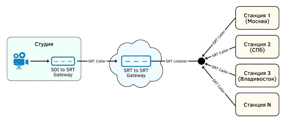 Второй гейтвей, расположенный в облачной инфраструктуре, выполняет преобразование SRT-SRT: он принимает поток и распределяет его клиентским станциям.