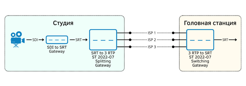 Один из распространённых кейсов — организация прямой трансляции, например, спортивного матча или студийного эфира. В такой схеме задействуются два гейтвея.