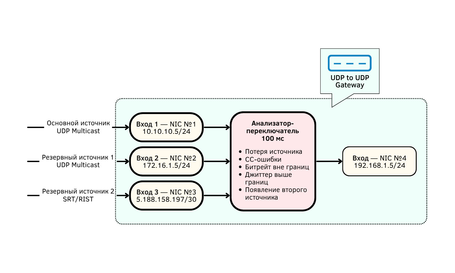 Гейтвеи также применяются внутри одной локальной сети для организации резервирования источников. Эти источники могут доставляться различными протоколами (UDP, RTP, SRT, RIST) и через разные сетевые интерфейсы. Например, можно получать основной и несколько резервных источников из разных подсетей или даже извне, а также настроить приоритет резервных источников.