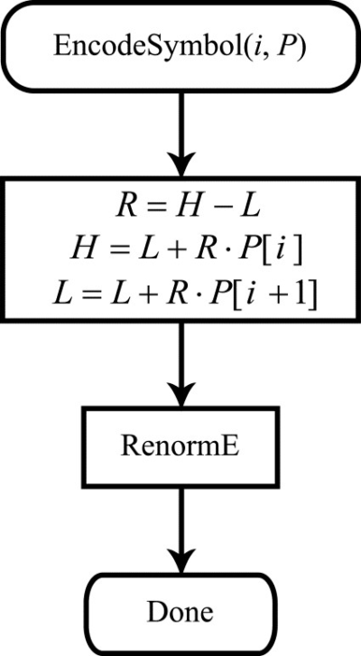 Процедура EncodeSymbol() принимает два аргумента: i — номер кодируемого символа в алфавите, P — массив значений Pi. Как видно из блок-схемы, на первом этапе кодирования вычисляется длина текущего интервала R (при этом используются текущие значения его нижней L и верхней H границ). Величина H используется для вычисления новых обновленных значений границ интервала. Таким образом, на первом этапе кодирования каждого символа сообщения выполняется деление текущего отрезка. Второй этап кодирования представляет собой процедуру ренормализации (рис. 2).