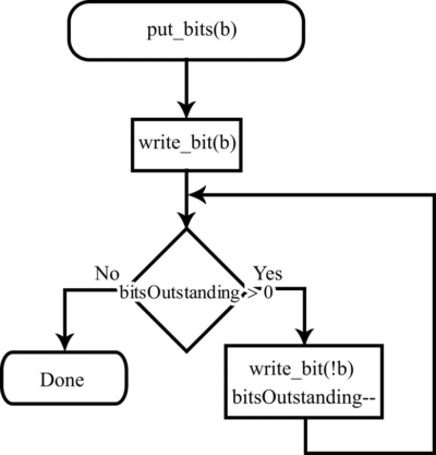 Как уже было сказано при описании процедуры ренормализации, если текущий интервал полностью лежит в диапазоне [0, 1), т. е. если H<1/2, то в выходной битовый поток записывается значение 0 и последовательность из значений 1, длина которой равна значению переменной bitsOutstanding. Все эти действия выполняются процедурой put_bits(), блок-схема которой представлена на рис. 3. Значения границ интервала L и H удваиваются. Если текущий интервал полностью лежит в диапазоне [1/2, 1), т. е. если L больше или равно 1/2, то в выходной поток записывается 1 и последовательность из 0, длина которой равна значению переменной bitsOutstanding (здесь опять используется процедура put_bits()). Изменение значений границ интервала в этом случае происходит таким образом, чтобы в два раза увеличилось расстояние от L и H до 1. Обновленные значения L и H, таким образом, можно рассчитать как: L = 1 — 2(1 — L) = 2L — 1 = 2(L — 1/2), H = 1 — 2(1 — H) = 2H — 1 = 2(H — 1/2), что и выполняется в этой ветви процедуры RenormE. Наконец, если текущий интервал полностью лежит в дипазоне [1/4, 3/4), т. е. если L больше или равно 1/4, и H<3/4, то значение величины bitsOutstanding увеличивается на 1, а границы интервала сдвигаются таким образом, чтобы в два раза увеличилось расстояние от L и H до 1/2: L = 1/2 — 2(1/2 — L) = 2L — 1/2 = 2(L — 1/4), H = 1/2 + 2(H — 1/2) = 2H — 1/2 = 2(H — 1/4), что и выполняется в этой ветви процедуры RenormE. На рис. 3 представлена блок-схема процедуры put_bits(). Эта процедура принимает в качестве аргумента значение бита (0 или 1) и записывает его в выходной битовый поток, представляющий результат арифметического кодирования. Процедура записи бита в поток на блок-схеме условно обозначена как write_bit(). После выполнения записи производится проверка значения переменной bitsOutstanding. Производится запись в поток последовательности значений !b (здесь в блок-схеме использовано обозначение операции «НЕ» из языка C), длина которой равна значению bitsOutstanding. Олег Пономарев — специалист в области распространения радиоволн, статистической радиофизики, доцент кафедры радиофизики НИ ТГУ, кандидат физико-математических наук. 16 лет занимается вопросами видео кодирования и цифровой обработки сигналов. Руководитель исследовательской лаборатории Elecard.