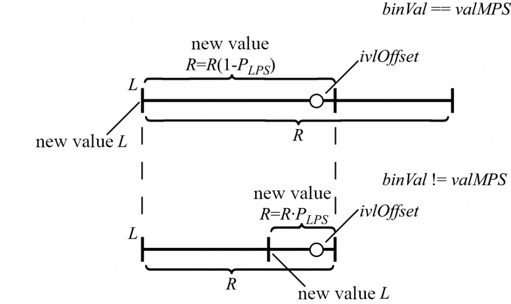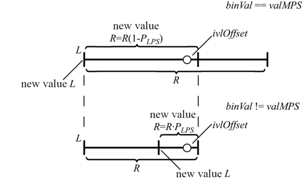 Итак, пусть число, характеризующее соотношение частей отрезка при его итеративном делении, будет равно PLPS. Обозначим, используя обозначения из стандарта HEVC, значение (0 или 1) наиболее вероятного бина в кодируемой последовательности за valMPS. Значение текущего кодируемого бина будем характеризовать величиной binVal. Положение левой границы текущего интервала по-прежнему будем обозначать значением L. Длину текущего интервала — R. В том случае, если значение текущего кодируемого бина равно valMPS, вычисление новых значений L и R по их текущим значениям и PLPSможно вычислить как (рис. 1):