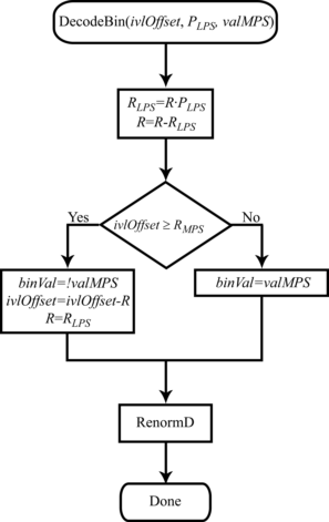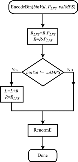L=L. В том же случае, когда значение кодируемого бина не совпадает со значением valMPS, новые значения L и R определяются выражениями (рис. 2): R=R⋅PLPS, L=L+R(1−PLPS). В результате получаем несколько обновленную блок-схему (рис. 3) алгоритма теперь уже двоичного арифметического кодирования.
