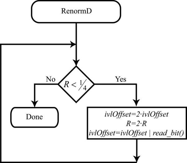До сих пор положение на числовой оси текущего отрезка, который мы делим при кодировании сообщения, характеризовалось положением конечных точек этого отрезка L и H. Очевидно, что описывать текущее состояние процедуры арифметического кодирования (положение отрезка на числовой оси) можно и с помощью чисел L и R, где R — длина отрезка. Именно такое описание используется в стандарте HEVC.