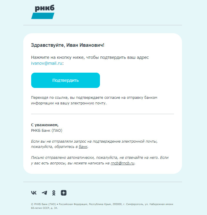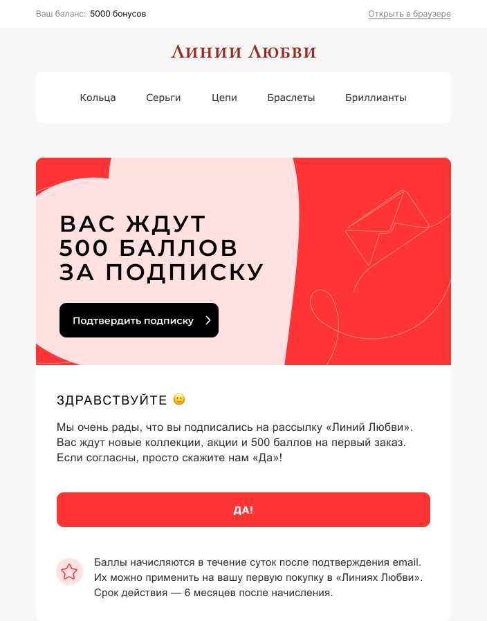 Следующий шаг — разделить валидные адреса на сегменты по «возрасту»: добавлены в базу меньше 3 месяцев назад, от 4 до 6 месяцев и так далее. Это пригодится при отправке первого письма. Как установить сроки получения емейла? Проверьте в базе данных или CRM-системе, когда клиент дал согласие на обработку ПД. Бывает, что точно установить дату добавления контакта в базу нельзя. Таких пользователей тоже нужно выделить в самостоятельный сегмент. Необязательный, но полезный этап — выяснить, как емейл попал в базу. Если знать, что пользователь совершил то или иное действие, то установить с ним контакт будет проще. Например, человек участвовал в розыгрыше, регистрировался на мероприятие или скачивал лид-магнит. Напомнив об этом в первом письме, компания покажет, что отправила его неслучайно. Однако если прошло более трёх месяцев, то лучше не называть конкретное событие, чтобы не создавать путаницу: ❌ Вы получили это письмо, потому что в 2022 году регистрировались на вебинар Ивана Петрова о трендах CRM-маркетинга ✔️ Вы получили это письмо, потому что регистрировались на один из наших вебинаров Если таких подробностей нет, хотя бы подчеркните, что контакт получен легально. Скажем, можно упомянуть, что пользователь уже делал покупку или участвует в бонусной программе. А если вообще нет информации о контакте? В таком случае стоит напомнить пользователю, что вы когда-то уже встречались, и предложить познакомиться поближе. Итак, база подготовлена. Теперь в ней только действительные адреса пользователей, которые дали согласие на обработку ПД. Выделены свежие контакты, известен их источник. Что дальше? Для запуска емейл-коммуникации нужно получить согласие на рекламные сообщения. Для этого отправляем письмо с просьбой подтвердить подписку — DOI. Оно относится к транзакционным, поэтому такая рассылка не противоречит закону (момент проявился!). Письмо для подтверждения рассылки может выглядеть так: Будет здорово учесть все пункты и сделать аргументированное письмо — а ещё добавить бонус за подписку. Но в целом подойдёт и простое DOI в стилистике компании. Также нужно создать страницу подтверждения, куда подписчик попадёт после клика. Она покажет человеку, что он всё сделал правильно. На странице можно поблагодарить за подписку, попросить больше информации или отослать на главную сайта. Вот несколько удачных DOI-писем для вдохновения. Среди них есть и подробные, и лаконичные. Мы сделали DOI-письмо, но и его нельзя отправить всей базе разом. При таком подходе сообщение может попасть в спам, а домен — получить плохую репутацию. А если он ещё не использовался для отправки рассылок, то DOI одновременно будет решать задачу прогрева домена. Правильная тактика — выделить тестовый сегмент и отправить письмо ему. Это позволит не только избежать проблем со спамом, но и проверить гипотезы о контенте сообщения. Рекомендую подготовить несколько вариантов DOI: с разными темами, дизайном, с бонусом и без него. Это необязательно, но поможет достичь лучших показателей при отправке письма на основную часть старой базы. Размер тестового сегмента — 10–20% базы. Письмо стоит отправлять небольшими порциями, особенно если вы тестируете разные варианты DOI. После отправки обязательно изучите метрики и выберите самый эффективный вариант письма. При оценке результатов можно ориен