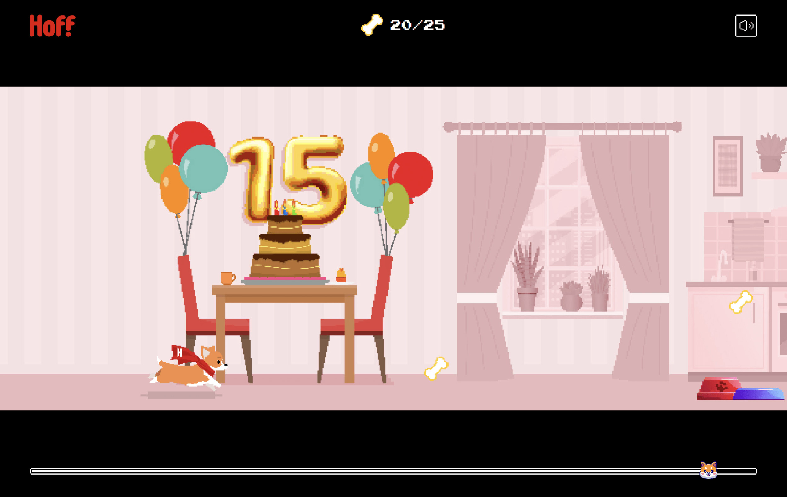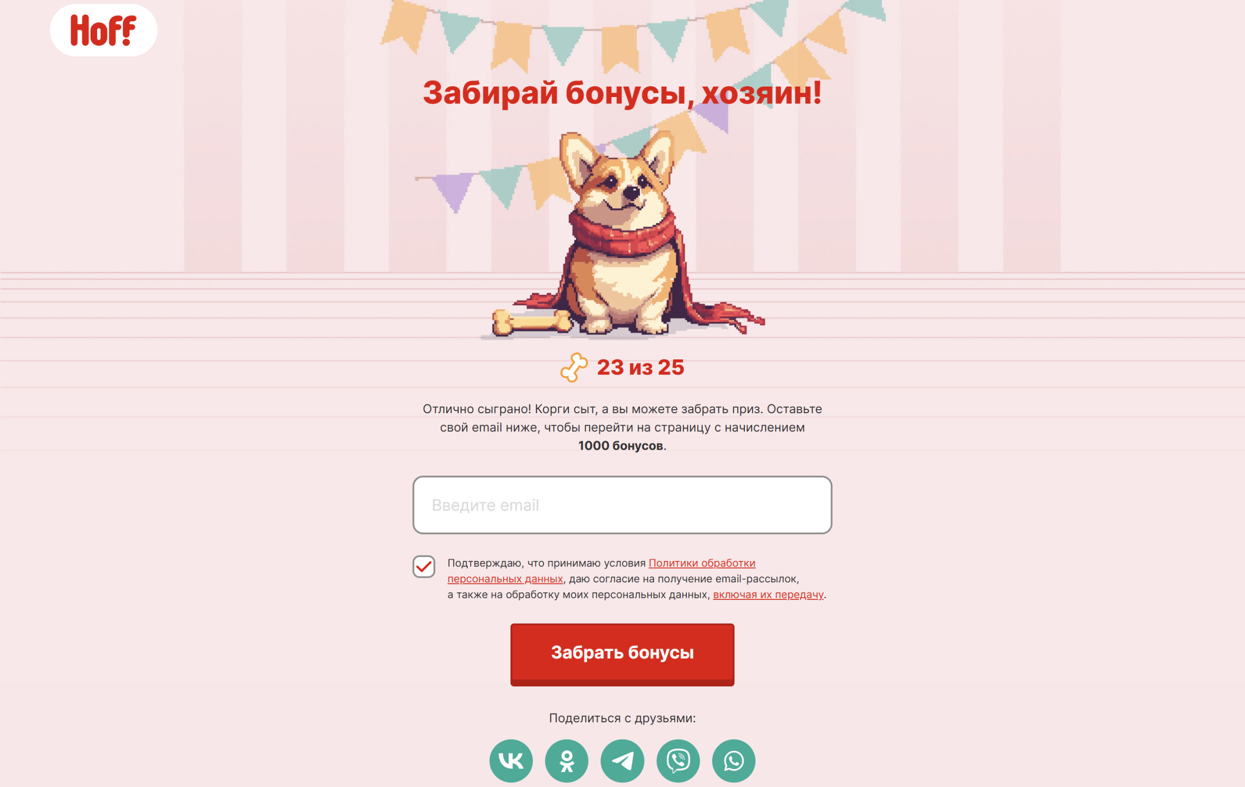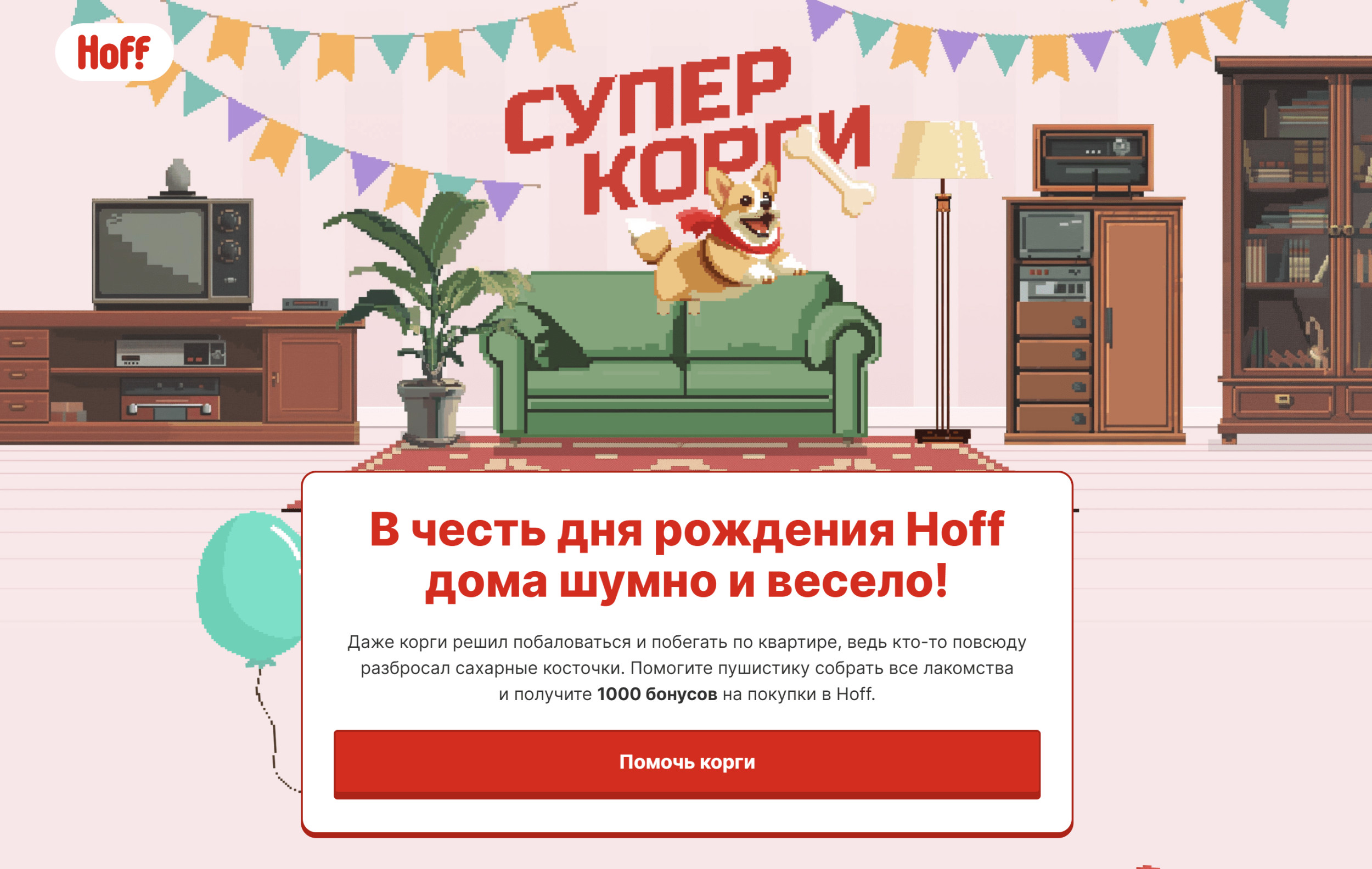 Персонажем стал корги — это маскот компании и по совместительству мемная порода, синоним милоты и веселья. Цель игрока — собрать сахарные косточки, перепрыгивая разложенные на полу предметы и забираясь на мебель. Для игры предусмотрели приз — 1000 бонусных рублей в программе лояльности Hoff. Чтобы получить их, пользователь должен: 1. Собрать минимум 15 косточек из 25 (число попыток не ограничивалось). Это повышало вероятность того, что игрок воспользуется баллами, ведь заработанная, а не просто полученная награда ощущается более ценной и её хочется пустить в дело. 2. Оставить почту. Чтобы повысить конверсию в заполнение формы, мы разместили её на последнем экране. Другими словами, запрашивали почту после того, как вовлекли пользователя самой игрой. В основу проекта мы положили слоган Hoff: «Дом — это личное». Так, сеттингом игры стали уютные комнаты, заполненные мебелью и декором советской эпохи. Это добавляло ностальгии и мысленно переносило игроков в детство, когда праздники и их предвкушение были волшебным временем. Геймплей сделали таким, чтобы игра не требовала больших усилий от пользователя. Для этого предусмотрели управление одной кнопкой и низкую сложность препятствий. Также добавили шкалу прогресса и счётчик очков. Шкала показывала игроку, что игра не займёт много времени. Счётчик демонстрировал прогресс, добавляя азарта. В мобильной версии для удобства мы перенесли шкалу прогресса наверх, а в низ экрана добавили кнопку «Прыжок». Доработка оказалась оправданной: по факту 84,2% игроков использовали смартфоны. В мобильной версии для удобства мы перенесли шкалу прогресса наверх, а в низ экрана добавили кнопку «Прыжок». Доработка оказалась оправданной: по факту 84,2% игроков использовали смартфоны. Чтобы пользователям было проще, мы выполнили в более ярких цветах предметы, с которыми можно взаимодействовать. А для разнообразия игрового процесса: В проекте мы уделили особое внимание дизайну. Важно было заинтересовать пользователей дойти до конца, передать праздничную атмосферу и показать связь игры с брендом. Модный пиксель-арт усиливал детские воспоминания игроков, напоминая об играх Dendy. Для ещё большего эффекта мы использовали музыку и звуковые эффекты в духе «Супер Марио». Найти пиксельную советскую мебель на стоках оказалось трудно, поэтому большинство предметов интерьера мы перерисовали с реальных. Также мы использовали нейросети: с помощью Midjourney сделали пиксельных корги для стартового и финальных экранов. Сгенерированные изображения доработали и подогнали под общий стиль проекта. Праздничную атмосферу создавали гирлянды-растяжки и шарики, а в последней локации — кухне — большой торт и надувные цифры. Связь игры с брендом передавал в первую очередь домашний сеттинг, а также фирменный красный на многих экранах и шарфик с буквой H у главного героя. Проект решил все поставленные задачи. 90,5% пользователей, которые начали игру, прошли её до конца. 10% — сыграли повторно, 5,3% — пошерили. Это значит, что спецпроект понравился аудитории Hoff и стал для бренда эффективной точкой касания с клиентами. 83,4% игроков оставили емейл, треть из них — новые подписчики Hoff. Конверсия из подписки в регистрацию в ПЛ составила 48,1%. Наконец, 10,4% новых подписчиков совершили покупку с использованием бонусов. Дополнительная выручка (по методу кон