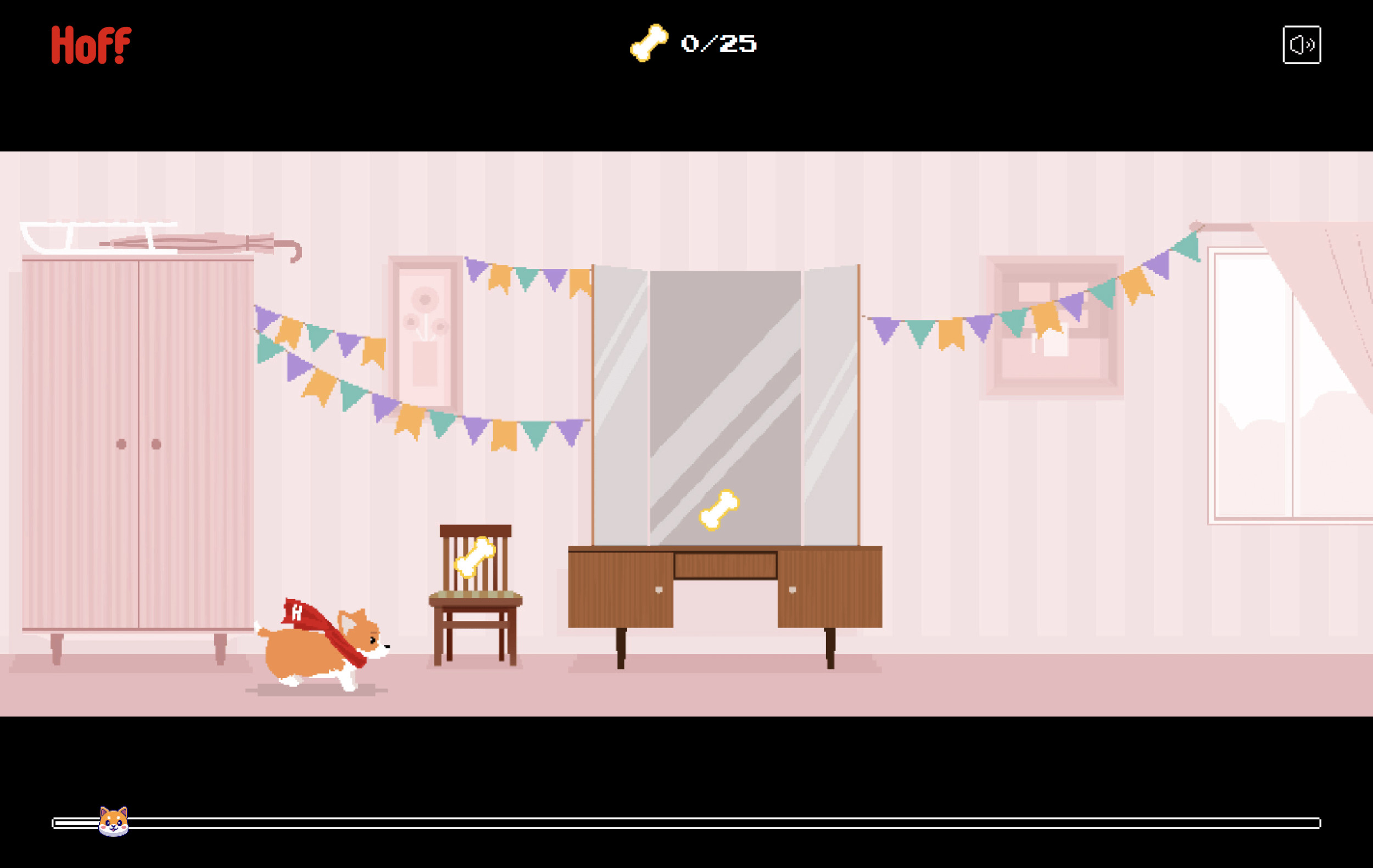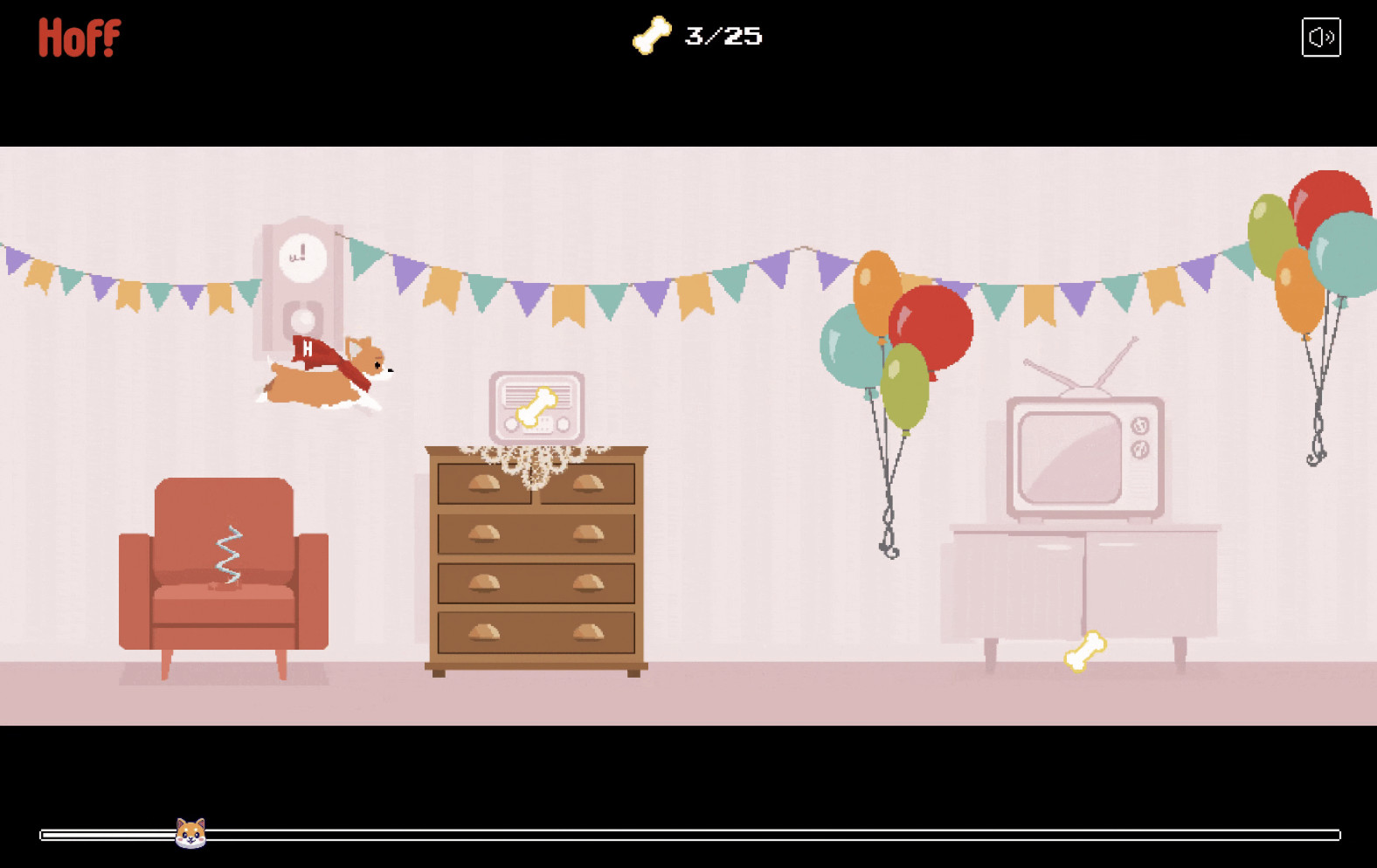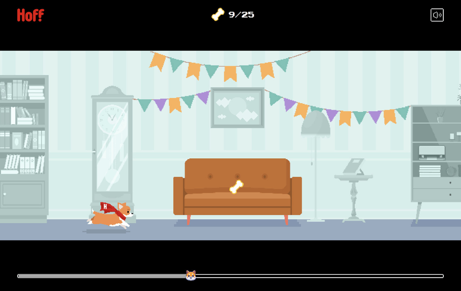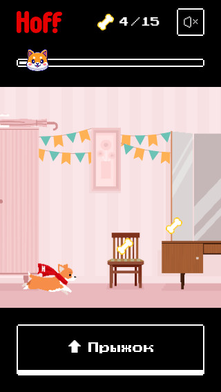Персонажем стал корги — это маскот компании и по совместительству мемная порода, синоним милоты и веселья. Цель игрока — собрать сахарные косточки, перепрыгивая разложенные на полу предметы и забираясь на мебель. Для игры предусмотрели приз — 1000 бонусных рублей в программе лояльности Hoff. Чтобы получить их, пользователь должен: 1. Собрать минимум 15 косточек из 25 (число попыток не ограничивалось). Это повышало вероятность того, что игрок воспользуется баллами, ведь заработанная, а не просто полученная награда ощущается более ценной и её хочется пустить в дело. 2. Оставить почту. Чтобы повысить конверсию в заполнение формы, мы разместили её на последнем экране. Другими словами, запрашивали почту после того, как вовлекли пользователя самой игрой. В основу проекта мы положили слоган Hoff: «Дом — это личное». Так, сеттингом игры стали уютные комнаты, заполненные мебелью и декором советской эпохи. Это добавляло ностальгии и мысленно переносило игроков в детство, когда праздники и их предвкушение были волшебным временем. Геймплей сделали таким, чтобы игра не требовала больших усилий от пользователя. Для этого предусмотрели управление одной кнопкой и низкую сложность препятствий. Также добавили шкалу прогресса и счётчик очков. Шкала показывала игроку, что игра не займёт много времени. Счётчик демонстрировал прогресс, добавляя азарта. В мобильной версии для удобства мы перенесли шкалу прогресса наверх, а в низ экрана добавили кнопку «Прыжок». Доработка оказалась оправданной: по факту 84,2% игроков использовали смартфоны. В мобильной версии для удобства мы перенесли шкалу прогресса наверх, а в низ экрана добавили кнопку «Прыжок». Доработка оказалась оправданной: по факту 84,2% игроков использовали смартфоны. Чтобы пользователям было проще, мы выполнили в более ярких цветах предметы, с которыми можно взаимодействовать. А для разнообразия игрового процесса: В проекте мы уделили особое внимание дизайну. Важно было заинтересовать пользователей дойти до конца, передать праздничную атмосферу и показать связь игры с брендом. Модный пиксель-арт усиливал детские воспоминания игроков, напоминая об играх Dendy. Для ещё большего эффекта мы использовали музыку и звуковые эффекты в духе «Супер Марио». Найти пиксельную советскую мебель на стоках оказалось трудно, поэтому большинство предметов интерьера мы перерисовали с реальных. Также мы использовали нейросети: с помощью Midjourney сделали пиксельных корги для стартового и финальных экранов. Сгенерированные изображения доработали и подогнали под общий стиль проекта. Праздничную атмосферу создавали гирлянды-растяжки и шарики, а в последней локации — кухне — большой торт и надувные цифры. Связь игры с брендом передавал в первую очередь домашний сеттинг, а также фирменный красный на многих экранах и шарфик с буквой H у главного героя. Проект решил все поставленные задачи. 90,5% пользователей, которые начали игру, прошли её до конца. 10% — сыграли повторно, 5,3% — пошерили. Это значит, что спецпроект понравился аудитории Hoff и стал для бренда эффективной точкой касания с клиентами. 83,4% игроков оставили емейл, треть из них — новые подписчики Hoff. Конверсия из подписки в регистрацию в ПЛ составила 48,1%. Наконец, 10,4% новых подписчиков совершили покупку с использованием бонусов. Дополнительная выручка (по методу кон