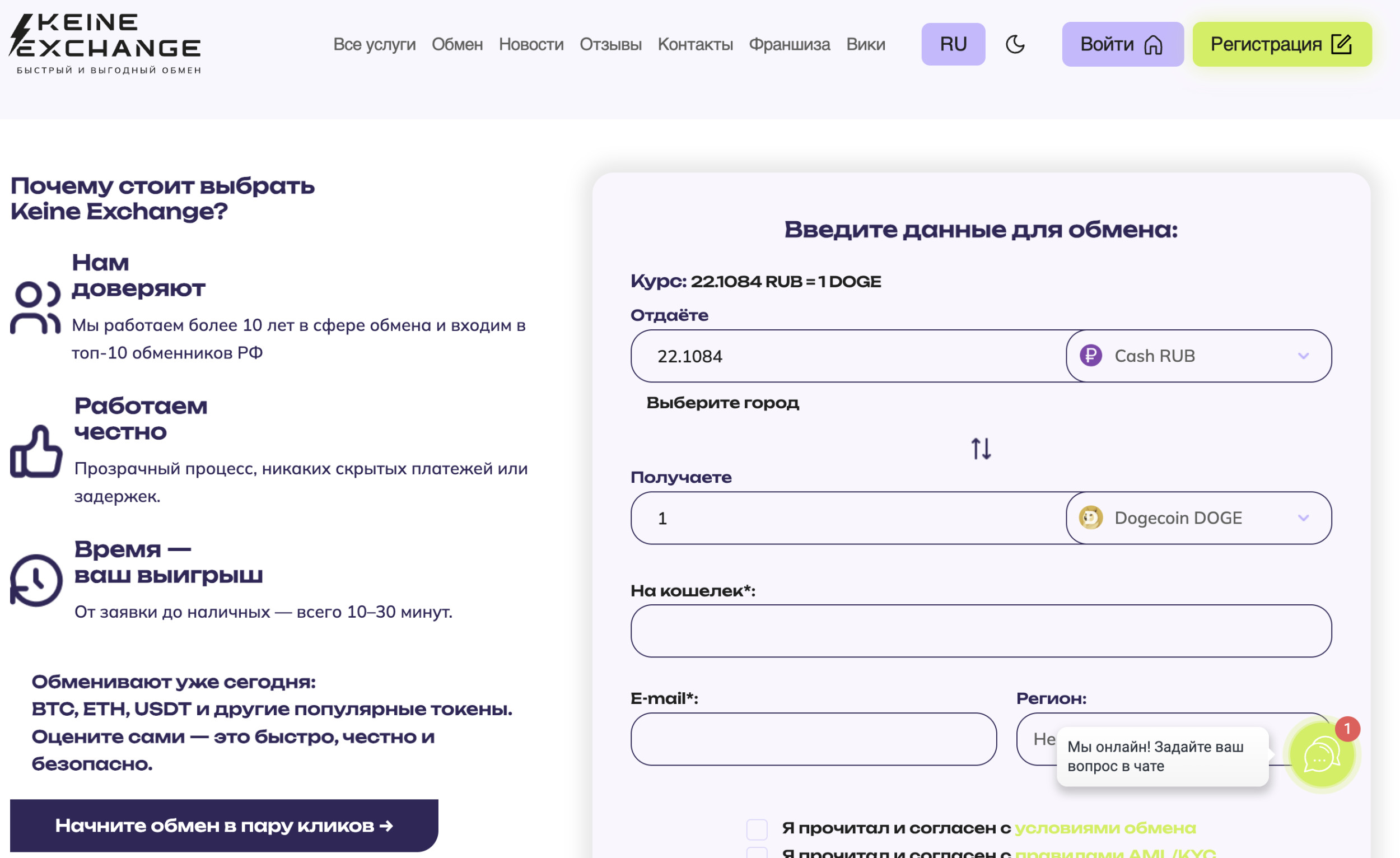 Обмен крипты в Keine-Exchange