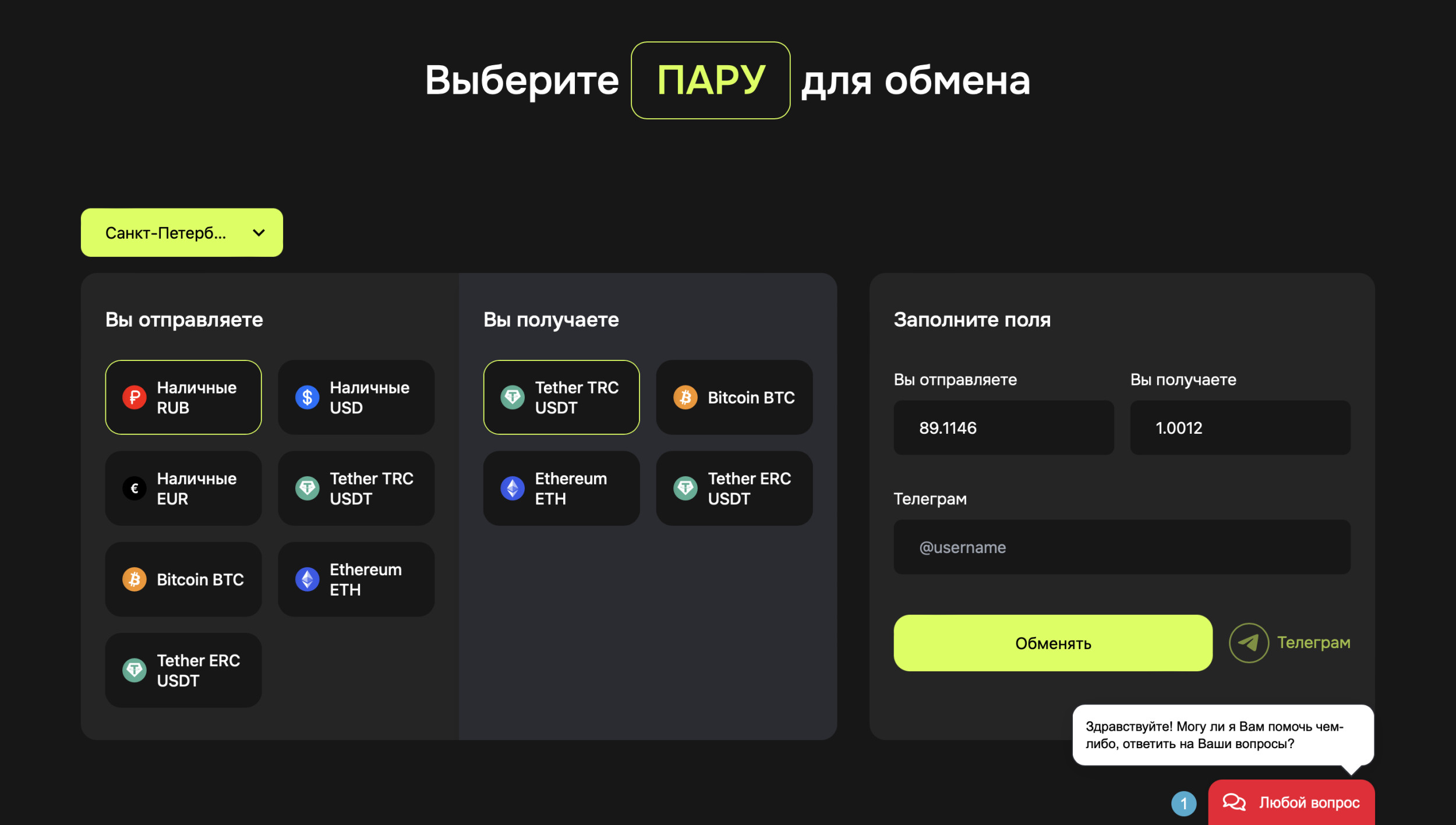 - Поддержка широкого спектра криптовалют в СПб, включая BTC и USDT.