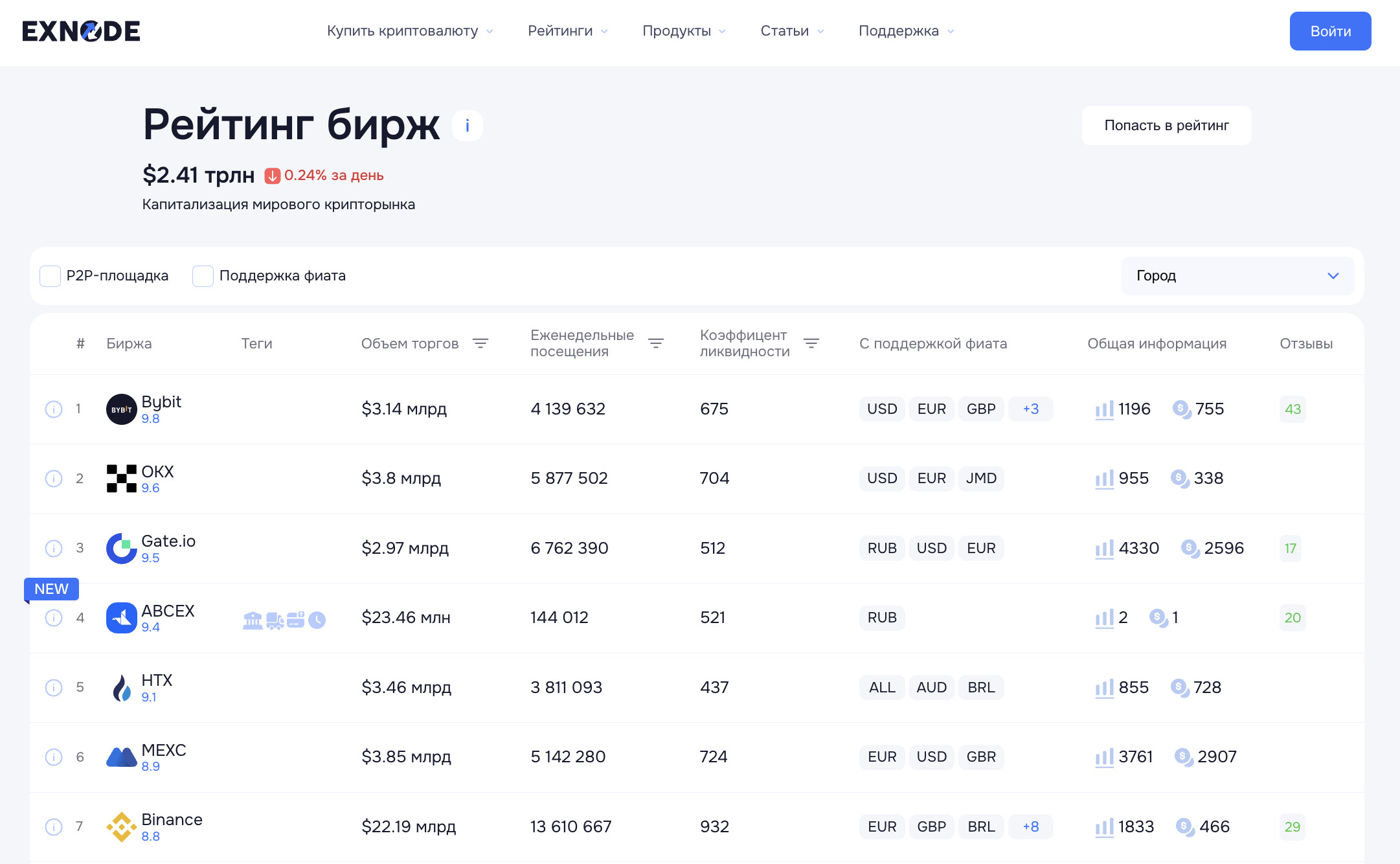 Чтобы выбрать оптимальную площадку для трейдинга, важно ознакомиться с рейтингом криптовалютных бирж. На сайте Exnode представлен актуальный рейтинг платформ, где можно сравнить комиссии, безопасность, ликвидность и другие важные параметры.