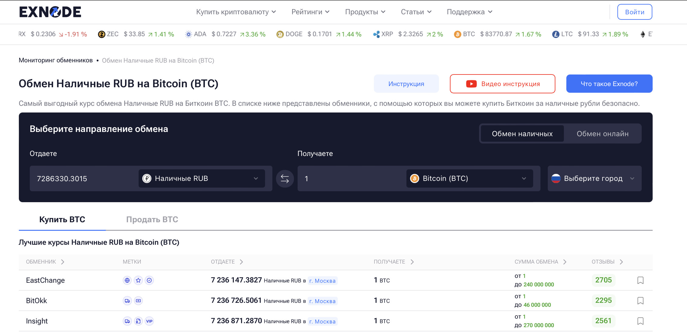 Используйте Exnode Trading, чтобы находить самые выгодные курсы и совершать сделки на лучших условиях. Select an Image Актуальный курс биткоина на сегодня на Exnode Trading Select an Image В 2025 году покупка биткоина в России остаётся востребованной, но требует внимательного выбора способа приобретения. Из-за изменений в регулировании и растущей популярности криптовалют у пользователей появилось несколько основных вариантов, среди которых оффлайн криптообменники, биржи, P2P-платформы, криптоматы и даже телеграм-боты. Криптообменники — это проверенные площадки, где можно быстро и безопасно обменять рубли на BTC. Среди главных преимуществ: Недостатки криптообменников: Если вы ищете, где купить биткоин в России за рубли, криптообменники остаются самым выгодным и надёжным вариантом. Select an Image Один из лучших способов — криптообменник Select an Image Биржи — это площадки для торговли криптовалютами. Они предлагают множество инструментов для трейдинга, однако имеют свои преимущества и недостатки для обычного пользователя. Преимущества: Недостатки: Этот вариант подходит тем, кто планирует торговать BTC, но если вам сейчас нужно просто купить биткоин в России, криптообменники будут более удобным решением. Select an Image Второй метод — покупка биткоина в России через криптобиржу Select an Image Криптоматы — специальные терминалы, где можно обменять наличные на BTC. Преимущества метода: Однако у криптоматов есть существенные минусы: Select an Image Третий способ — криптоматы Select an Image В 2025 году появилось множество телеграм-ботов, предлагающих покупку BTC. Преимущества такого способа: Но есть серьёзные риски: Поэтому, если вы хотите купить биткоин в России сейчас, выбирайте криптообменники — они обеспечивают безопасность, быстрые сделки и выгодные условия по сравнению с другими методами. Select an Image Четвертый метод — телеграм боты Select an Image Выбор надёжного криптообменника — ключевой фактор для безопасной и выгодной покупки биткоина. В 2025 году спрос на проверенные сервисы вырос, так как многие пользователи хотят купить биткоин за рубли быстро и без рисков. Благодаря Exnode, ведущему мониторингу криптообменников, был составлен ТОП-4 лучших сервисов, которые обеспечивают выгодный курс, безопасность и удобство для пользователей в России. EastChange — это один из самых надёжных криптообменников, который предлагает лучшие курсы на покупку и продажу биткоина. Этот обменник уже несколько лет входит в рейтинг Exnode, оставаясь одним из самых популярных в России. Преимущества: Если вы ищете, где купить биткоин в России, EastChange остаётся одним из лучших вариантов. Select an Image Один из лучших сервисов для покупки биткоина в России — EastChange Select an Image BitOkk — это проверенный криптообменник, который предлагает широкий выбор направлений обмена. Он особенно удобен для тех, кто хочет быстро обменять биткоин за рубли в России. Преимущества: Этот обменник — отличный вариант для тех, кто ищет безопасную платформу для покупки BTC. Select an Image Второй обменник — BitOkk Select an Image Если вам нужно купить или продать биткоин за рубли на крупную сумму, Insight — один из самых подходящих вариантов. Этот криптообменник известен своей конфиденциальностью и высокими лимитами. Преимущества: Insight — это оптимальный выбор для крупных инвесторов и опытных пользователей, которые ищут, где выгодно купить биткоин в России в 2025 году. Select an Image Обменник крип