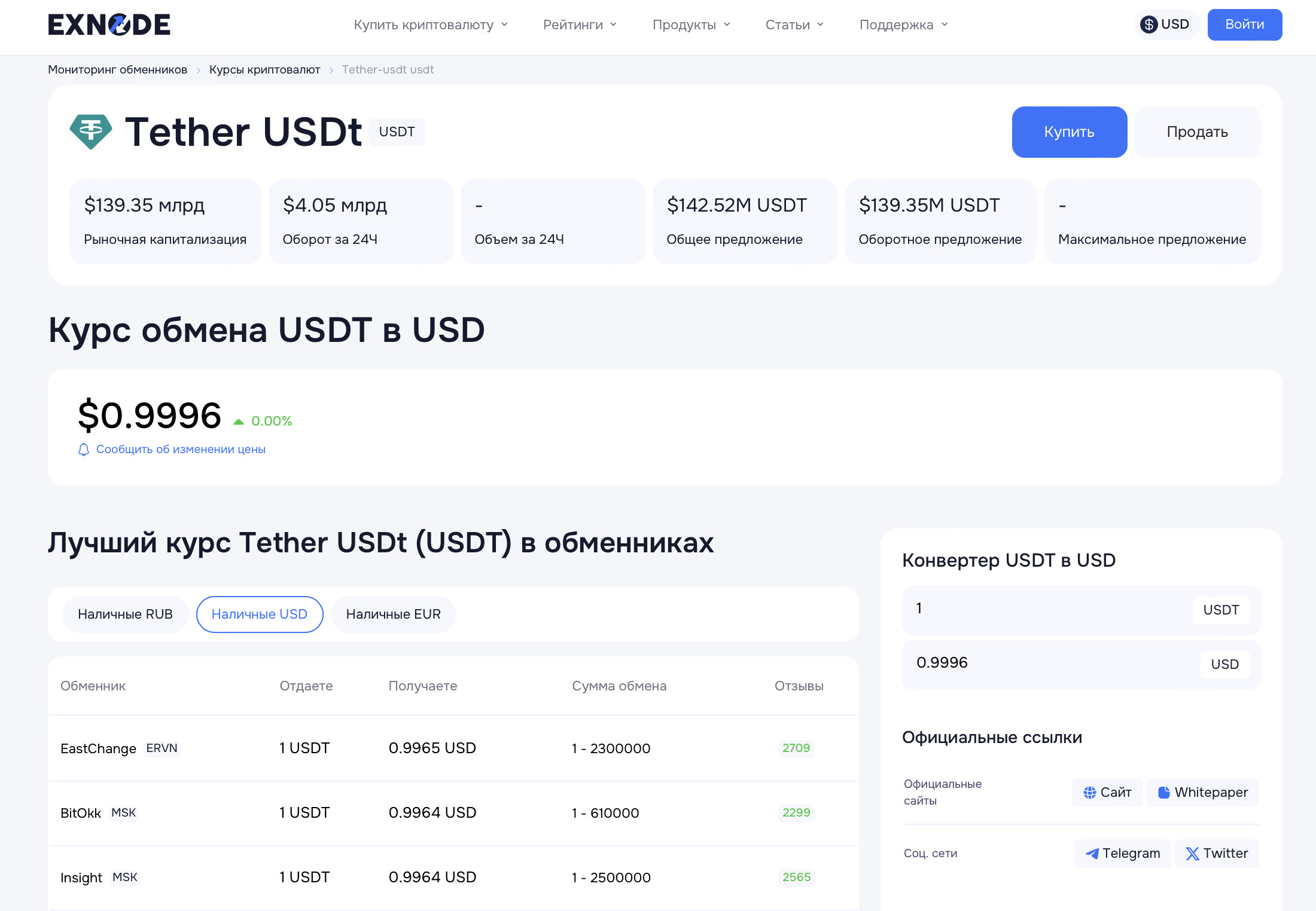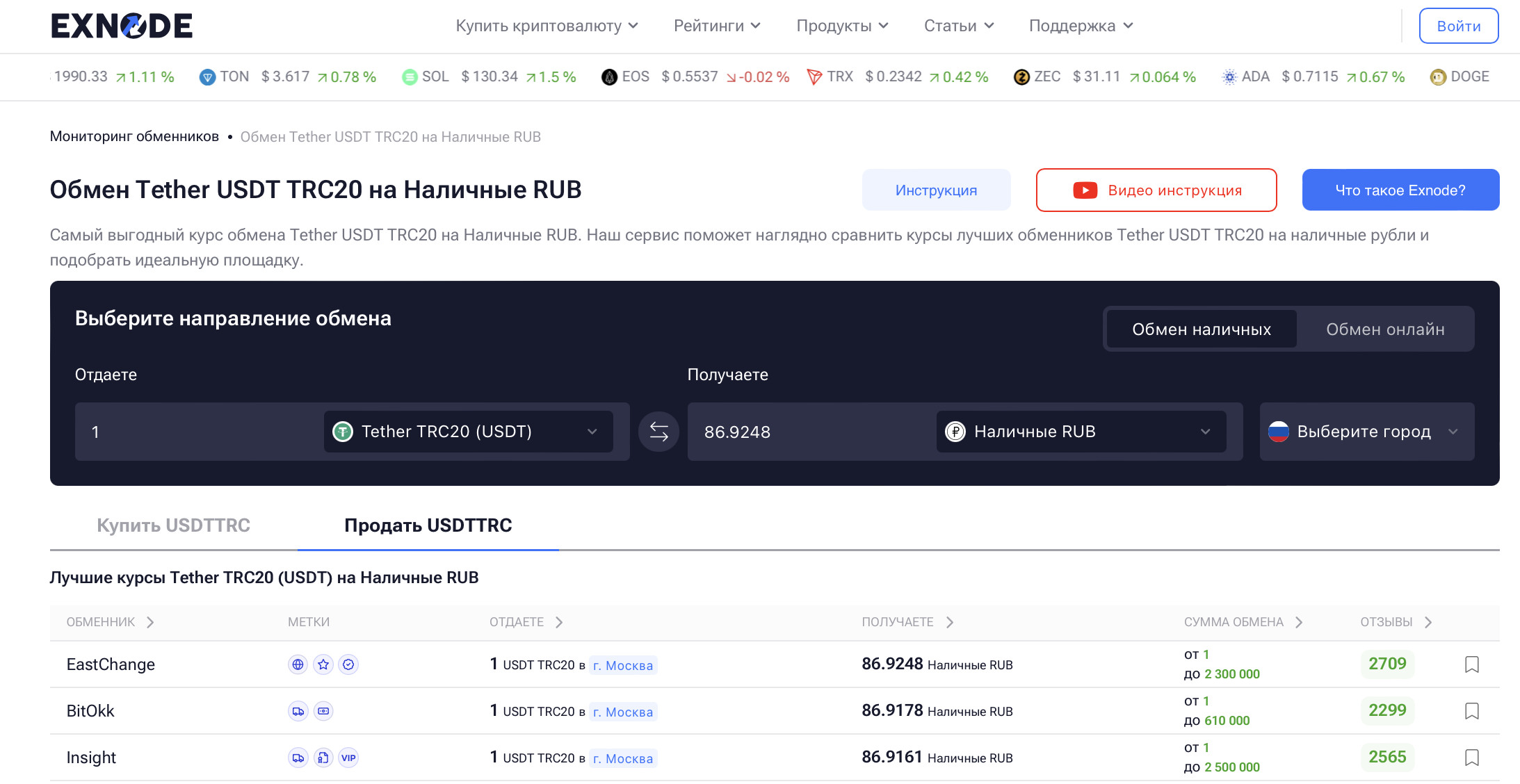 Если вам важно автоматическое обслуживание, криптомат может подойти, но по совокупности условий это один из наименее выгодных способов. Личный обмен через P2P-платформы или Telegram-чаты — способ, который позволяет напрямую договориться с другим человеком и обменять USDT на наличные. Но этот вариант сопряжён с максимальным уровнем риска. Преимущества: Недостатки: Такой вариант подходит только опытным пользователям, которые знают, как себя обезопасить, и готовы самостоятельно проверять партнёров. Для тех, кто хочет обменять USDT на наличные быстро, выгодно и безопасно, наилучшим решением остаются криптообменники. Несмотря на то, что они не работают круглосуточно и есть не в каждом городе, именно они предлагают оптимальное соотношение курса, комиссии, анонимности и юридической безопасности. Найти подходящий обменник и сравнить условия можно на мониторинге Exnode, что позволяет заранее выбрать наиболее выгодный и проверенный вариант. Выбрать надежное место, где можно обменять USDT на наличные, — задача не из лёгких. Курс, комиссия, безопасность сделки и удобство расположения — всё это имеет значение. Ниже представлен рейтинг лучших пунктов обмена, где можно провести обмен USDT на рубли наличные на выгодных и прозрачных условиях. Все обменники работают через офис, обеспечивают прозрачный курс и позволяют обменять USDT на наличные рубли быстро и без лишних процедур. EastChange — один из самых популярных обменников, особенно среди тех, кто ищет стабильность и высокие суммы. Здесь можно обменять USDT на наличные без скрытых комиссий. Предлагается поддержка популярных сетей — TRC-20 и ERC-20. Преимущества: BitOkk предлагает отличное сочетание скорости обслуживания и удобства. Это один из немногих обменников, где удобно как новичкам, так и опытным клиентам. Офис работает по предварительной записи, курсы обновляются в реальном времени, а заявки подтверждаются быстро. Почему стоит выбрать BitOkk: Если вы ищете конфиденциальность при обмене, Insight будет отличным выбором. Здесь можно обменять USDT на наличные без необходимости регистрации и верификации. Паспорт потребуется только для пропуска в офис. Курсы — конкурентные, комиссии — отсутствуют Особенности Insight: KriptoObmennik подойдёт тем, кто делает это впервые. Интерфейс прост, менеджеры всегда на связи, а процесс сделки прозрачен. Платформа предлагает обмен USDT на наличные рубли без комиссии. Что предлагает KriptoObmennik: Итог: каждый из перечисленных обменников — проверенный вариант для тех, кто хочет обменять USDT на наличные рубли без лишнего риска. Перед визитом рекомендуется использовать мониторинг, такой как Exnode, чтобы сравнить курс и условия в режиме онлайн. Это сэкономит время и поможет выбрать максимально выгодный вариант. Прежде чем проводить операцию и обменивать USDT на наличные рубли, важно убедиться в надёжности выбранного обменного пункта. Рынок криптовалют насыщен предложениями, но не все из них одинаково безопасны. Чтобы не попасть в неприятную ситуацию и гарантированно получить наличные рубли USDT в обмен на цифровой актив, следуйте простым, но эффективным рекомендациям. 1. Проверяйте репутацию Первое, на что стоит обратить внимание, — это отзывы пользователей. Надежные обменные пункты, как правило, присутствуют на профильных форумах и в сервисах мониторинга. Отзывы должны быть развернутыми и живыми, а не вы
