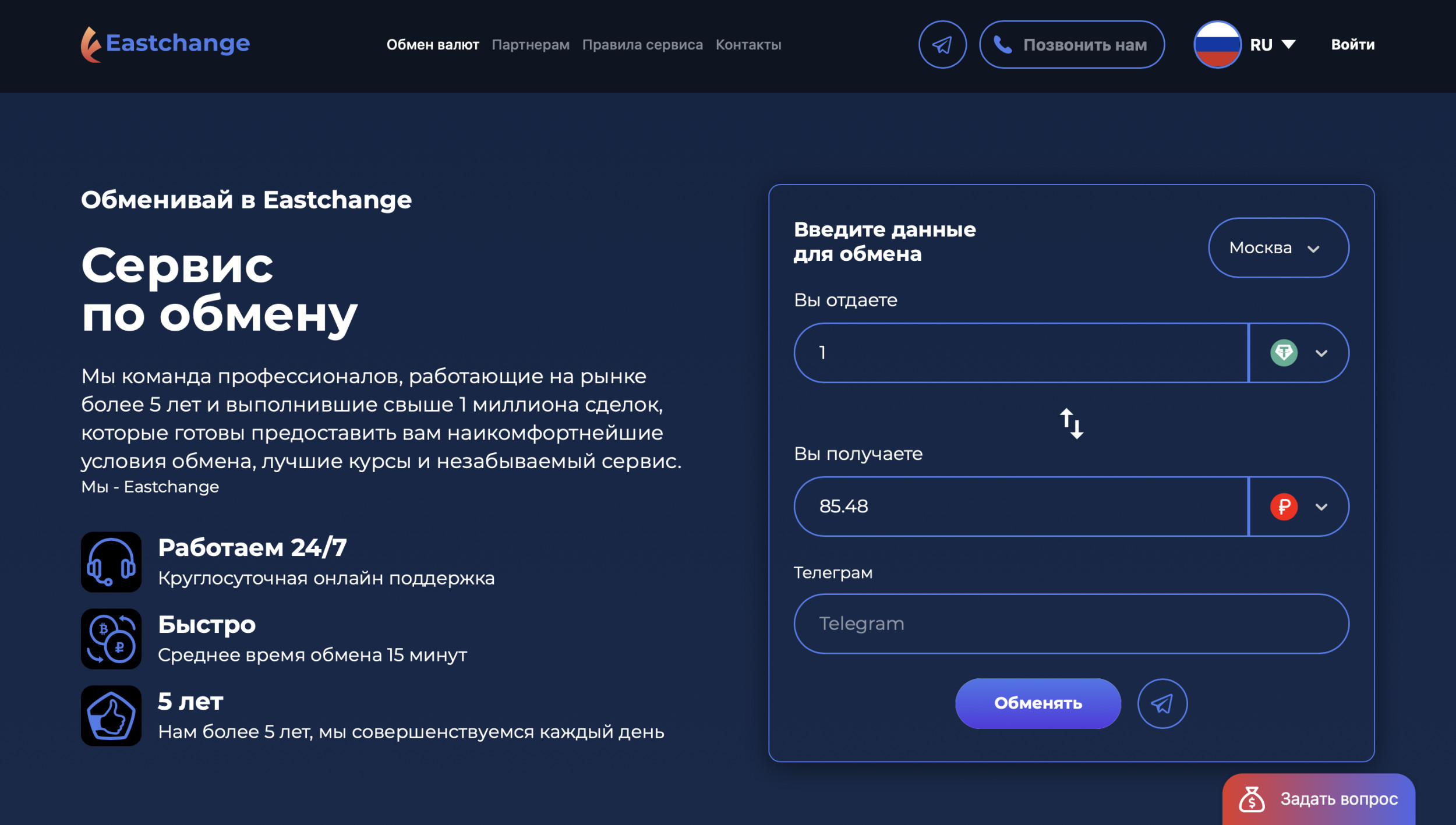 EastChange — один из самых стабильных и отзывчивых обменников. Здесь вы можете совершить сделку быстро и без лишней волокиты. Клиенты ценят сервис за высокий уровень безопасности и строгую политику верификации сделок. Кроме того, в офисах можно провести обмен крипты на наличные, что особенно актуально для тех, кто предпочитает личные встречи и живой контроль.