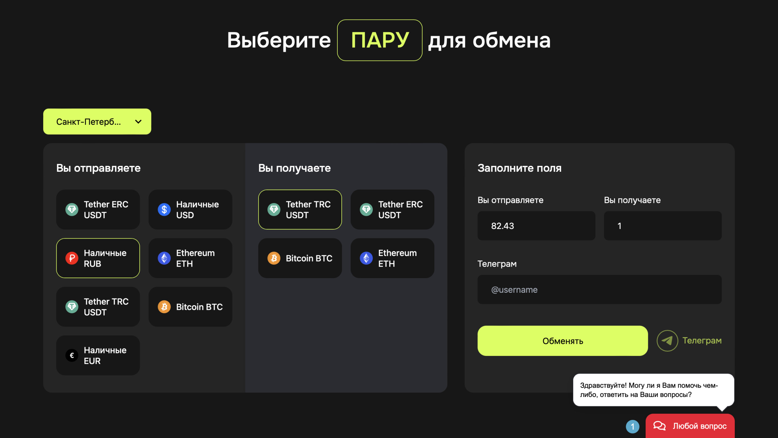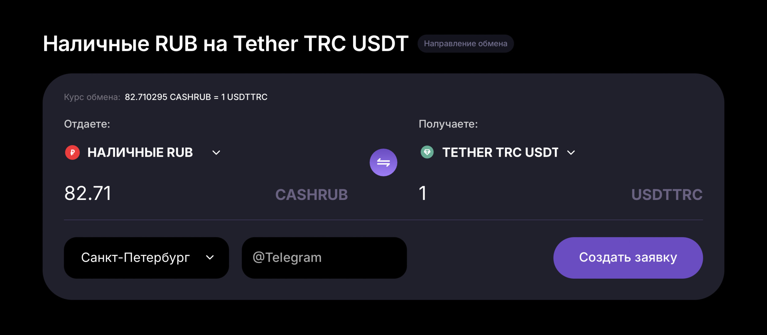 - ✅ Отсутствие комиссий. Обменники криптовалют СПб, поддерживающие обмен на наличные работают по курсу «из рук в руки», без скрытых комиссий, что делает сделку максимально выгодной.