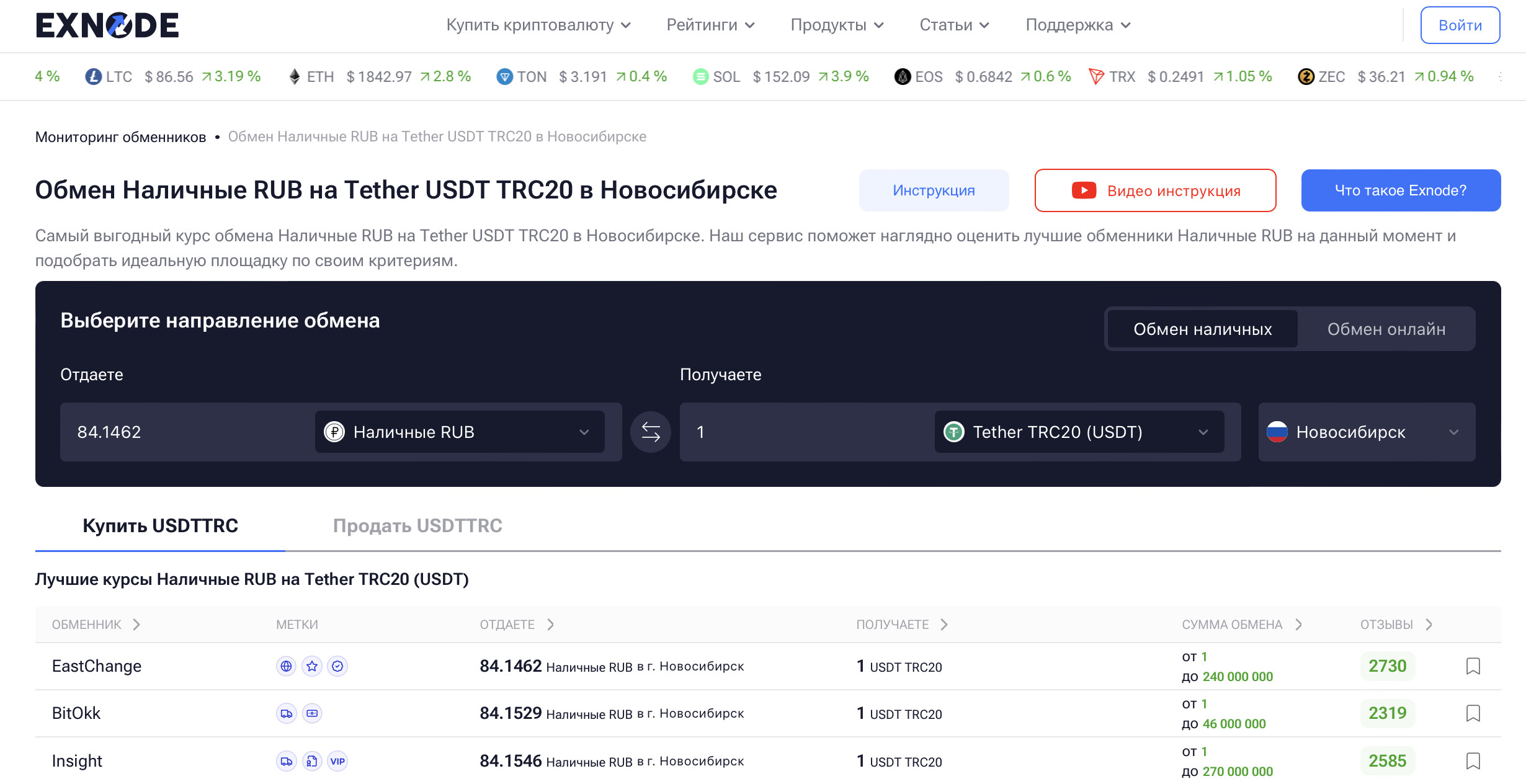 Чтобы найти надёжный обменник криптовалют в Новосибирске, лучше всего использовать мониторинговые сайты. Один из самых удобных — Exnode — собирает информацию о курсах, лимитах и репутации обменных пунктов. Сравните предложения, прочитайте отзывы и выберите подходящий криптообменник. 🔹 Шаг 2: Оформление заявки на сайте На сайте выбранного крипто обменника Новосибирска вам нужно указать: 🔹 Шаг 3: Связь с менеджером После подачи заявки представитель обменника напишет вам в Telegram. Он уточнит детали сделки, актуальный курс, сообщит адрес офиса и договорится с вами о точном времени визита. Такой подход обеспечивает персональное сопровождение на каждом этапе. 🔹 Шаг 4: Визит в офис и проведение сделки В назначенное время вы приходите в офис криптообменника в Новосибирске. Здесь всё происходит конфиденциально: 🔹 Шаг 5: Проверка поступления средств и завершение обмена Как только вы получаете деньшт, убедитесь, что сумма правильная. После этого обмен криптовалюты в Новосибирске завершён — без комиссии, быстро и без лишней бумажной волокиты. Такой формат удобен для новичков, поскольку исключает риски и даёт полный контроль над процессом. Если вы цените конфиденциальность, оперативность и хотите избежать проблем с блокировками, обмен крипты в Новосибирске через офис — оптимальный вариант. Многие жители Новосибирска сталкиваются с вопросом: где лучше обменять криптовалюту — на бирже, в онлайн-сервисе или всё же в проверенном офисе? И если вы не хотите переплачивать комиссии, регистрироваться с паспортом и ждать подтверждений — у криптообменников есть убедительные преимущества. Криптообменники Новосибирска предлагают то, чего нет ни у одной онлайн-платформы — живую сделку без посредников с полной анонимностью. Здесь не просят проходить KYC, не требуют селфи с паспортом и не замораживают средства «до выяснения обстоятельств». Вы просто приходите в офис, проводите обмен — и уходите с результатом в кошельке. Пользователи крипты в Новосибирске всё чаще выбирают именно офлайн-обмен благодаря: В отличие от криптобиржи, где вы зависите от системы, курса, технической поддержки и правил платформы, криптообменник работает просто: вы передаёте наличные — и получаете криптовалюту (или наоборот) на месте. Это особенно важно тем, кто работает с криптовалютой в Новосибирске регулярно: трейдерам, фрилансерам, инвесторам. Операции проходят без задержек, без лимитов и без подозрительных блокировок. А если вы ещё сомневаетесь — зайдите на сайты мониторинга. На них собраны только проверенные обменники криптовалют в Новосибирске, с отзывами пользователей, которые вы можете прочитать и убедиться в высоком уровне сервиса того или иного обменника. Именно поэтому обмен криптовалюты в Новосибирске через криптообменник — это по-прежнему лучший способ в 2025 году Обмен криптовалюты в Новосибирске — это не просто операция с цифровыми активами, а важный финансовый процесс, которому стоит доверять только проверенным партнёрам. Мы рассмотрели ТОП-4 лучших криптообменника Новосибирска — Insight, BitOkk, EastChange, и KriptoObmennik. Эти обменники заслужили доверие клиентов благодаря высокому уровню сервиса, конфиденциальности, отсутствию комиссий и возможности провести сделку быстро и безопасно. Если вы ищете обменник криптовалют Новосибирска, где можно продать или ку