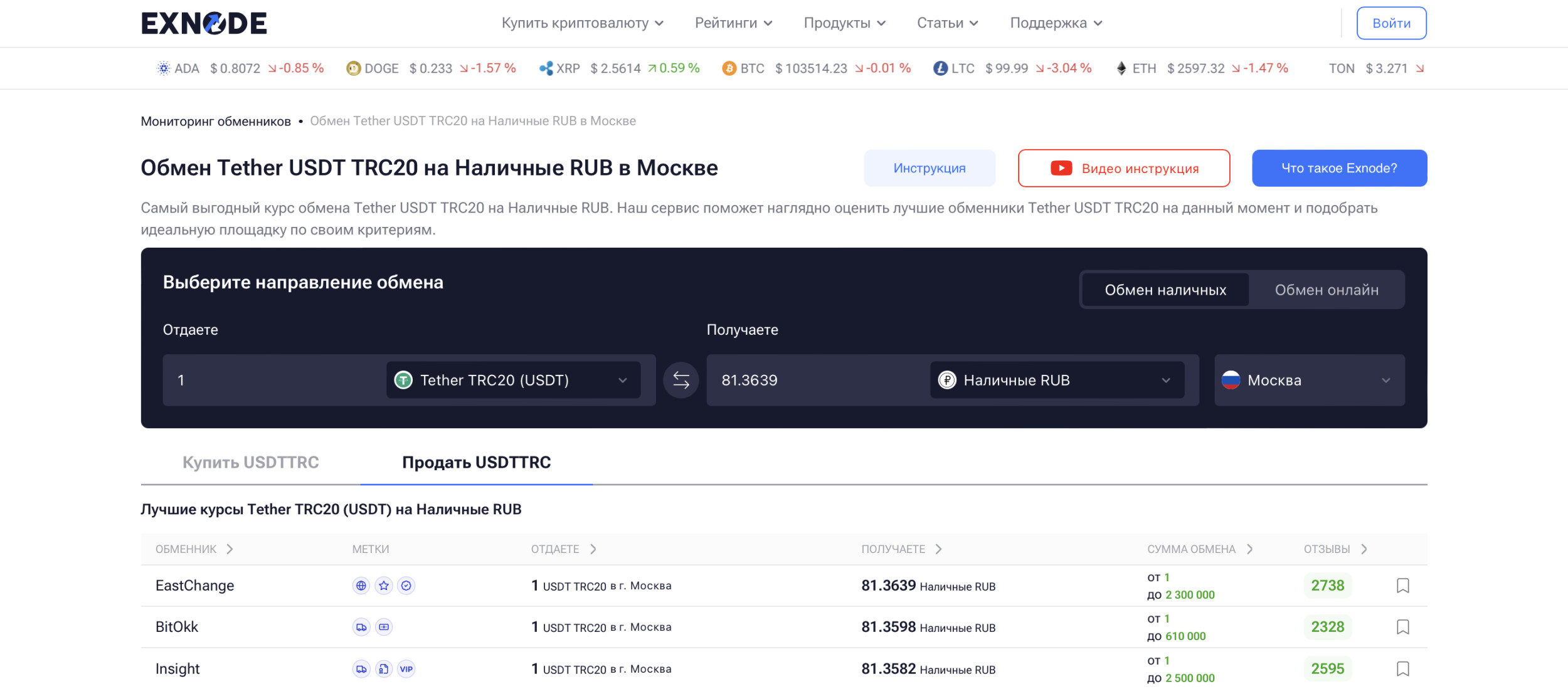 Первое, что нужно сделать — это подобрать надежный обменник криптовалют в Москве, поддерживающий обмен наличные. Чтобы не попасть на мошенников, воспользуйтесь мониторингом обменников, например Exnode — это удобный сервис, где собраны только проверенные платформы. Вы можете сравнить курсы, лимиты, отзывы и сразу выбрать подходящий вариант. 🔹 Шаг 2: Оформление заявки на сайте обменника Когда выбрали обменник — переходите на его сайт.В форме заявки указываете: 🔹 Шаг 3: Связь с менеджером После оформления заявки с вами свяжется менеджер обменника через Telegram. Он уточнит детали сделки и пришлёт точный адрес офиса. Это общение также позволяет убедиться, что перед вами реальный представитель платформы. 🔹 Шаг 4: Визит в офис криптообменника В назначенное время вы приезжаете в офис. На месте вы переводите USDT (или другую криптовалюту) на указанный кошелёк. Как только транзакция будет подтверждена, вам выдают наличные рубли. Всё проходит в рамках прозрачной и понятной процедуры. Криптовалюта давно вышла за пределы онлайна, и сегодня криптообменники в Москве — это полноценные офисы, где можно быстро, безопасно и без посредников обменять цифровые активы на рубли. Но у этого формата есть как сильные стороны, так и нюансы, о которых важно знать заранее. ✅ Преимущества: ❌ Недостатки: Вывод прост: если вы хотите обменять крипту на рубли быстро, выгодно и безопасно — криптообменники в Москве остаются лучшим решением. Да, нужно прийти в офис, но это компенсируется уровнем сервиса и уверенностью в результате. В Москве десятки обменных пунктов, и каждый на первый взгляд обещает лучшее. Но как отличить действительно надежный обменник криптовалют в Москве с обменом наличные от случайного офиса с сомнительной репутацией? Ниже — 5 ключевых факторов, на которые стоит обратить внимание перед сделкой. 🔹 1. Наличие офиса и очной сделки Настоящие криптообменники в Москве работают через физические офисы. Это снижает риск обмана и позволяет провести сделку лично с менеджером. Всегда уточняйте адрес заранее, проверяйте наличие охраны, режима работы и парковки. 🔹 2. Репутация и отзывы Читайте реальные отзывы на профильных сайтах, форумах и в Telegram-каналах. Надёжный обменник криптовалют в Москве с возможностью обмена на наличные — это тот, о котором пишут довольные клиенты, а не аккаунты-однодневки. 🔹 3. Прозрачные условия и отсутствие скрытых комиссий Уточняйте, входит ли комиссия в курс или добавляется отдельно. Хороший обменник всегда сообщает «чистую» цифру и не меняет условия в последний момент. 🔹 4. Безопасность и верификация Лучшие обменные точки работают по записи, и не требуют лишних документов. Паспорт может понадобиться только для оформления пропуска в бизнес-центр. 🔹 5. Выгодный курс и сравнение с рыночным Даже если все условия отличные — курс может «съедать» выгоду. Чтобы понять, насколько реально хороша цена, рекомендуем использовать раздел на сайте мониторинга Exnode — «Курсы криптовалют». Здесь можно отслеживать актуальные рыночные курсы более 100 монет и сравнивать их с предложениями обменников. Это простой способ не переплатить. В 2025 году обмен криптовалюты — это не про риски, а про комфорт, скорость и прозрачность. Именно поэтому криптообменники в Москве выходят на первый план: они предлагают клиенту то, чего не дают P2P и биржи — личный 