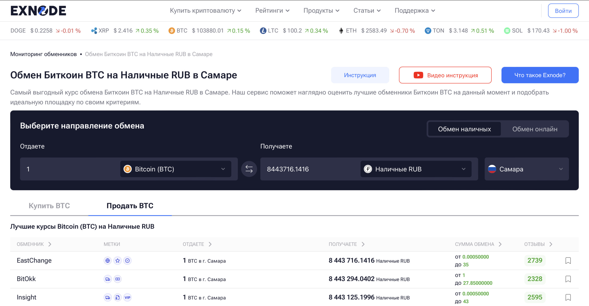 Первое, с чего стоит начать — это подбор надёжного обменного сервиса. Упростить задачу помогут специализированные сайты, такие как Exnode — здесь можно сравнить курсы, резервы, условия и выбрать подходящий крипто обменник в Самаре. Обратите внимание на рейтинг и отзывы. Шаг 2: Заявка на обмен После выбора обменника — переходите на его сайт. Там обычно есть форма заявки. Указываете направление обмена (например, USDT → RUB), сумму, и обязательно — свой ник в Telegram. Это необходимо, чтобы с вами мог связаться менеджер обменника. Шаг 3: Связь с менеджером В течение нескольких минут вам напишет представитель через Telegram. Он уточнит детали: доступность нужной суммы, условия, курс. И самое главное — отправит адрес офиса и предложит удобное время встречи. Шаг 4: Встреча в офисе В указанное время приходите в офис. Всё просто: вы переводите USDT на предоставленный криптокошелёк, сотрудник проверяет поступление средств — и вам тут же выдают наличные рубли. Это самый быстрый и надёжный способ купить или продать USDT его за фиат в Самаре. Выбор обменника — это не просто вопрос удобства. От него зависит ваша безопасность и курс сделки. Чтобы не прогадать, вот несколько признаков, по которым можно отличить надёжный обменник крипты в Самаре: 1. Прозрачные условия и понятный сайт. Обратите внимание: в хорошем криптообменнике в Самаре всегда можно узнать, какие именно криптовалюты принимаются и какие направления доступны. 2. Выгодные курсы. Важно уметь отличать «привлекательный курс» от рыночного. Для этого отлично подойдёт новый инструмент от мониторинга Exnode — раздел «Курсы криптовалют», где в реальном времени можно отследить рыночную стоимость более 100 криптовалют. Сравните с тем, что предлагает обменник — и вы уже понимаете, насколько предложение честное. 3. Наличие физического офиса. Да, важный момент — возможность прийти лично. Это всегда вызывает больше доверия. 4. Удобная поддержка и выбор валют. Надёжный обменник работает не только с USDT. Он предложит и ETH, и конечно, биткоин — в Самаре он пользуется стабильным спросом. И, что особенно удобно — в случае вопросов, вы сможете сразу связаться с менеджером по Telegram или телефону. Так что если вы собираетесь купить USDT в Самаре, не поленитесь изучить все детали заранее. А еще лучше — пользуйтесь теми, кто уже заслужил доверие временем и отзывами. Покупка и продажа криптовалюты давно вышли за рамки онлайна — и это отличная новость. Сегодня не обязательно регистрироваться на бирже, проходить верификацию, ждать подтверждений и переживать из-за блокировок. Всё куда проще, если воспользоваться обычным криптообменником в Самаре. Рынок криптовалют стремительно взрослеет — и Самара в этом смысле давно перестала быть аутсайдером. Сегодня здесь работают десятки обменных сервисов, но по-настоящему надёжных — единицы. Мы рассказали о тех, кто заслуживает доверия: Insight, BitOkk, Vip-Obmen, EastChange и KriptoObmennik. Эти обменники проверены временем, отзывами клиентов и реальными сделками. Если вы хотите купить USDT в Самаре, обменять биткоин, эфир и просто быстро и спокойно получить наличные — не рискуйте с сомнительными предложениями. Пользуйтесь сервисами, где всё понятно: от заявки до рублевых купюр в руках. А если хотите идти ещё дальше — сравнивайте курсы заранее. Раздел «Курсы криптовалют» на сайте Exnode поможет вам оценить реальную стоимо