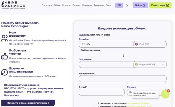 Keine-Exchange — один из наиболее стабильных и надёжных обменников Самары. Сервис делает акцент на безопасность, конфиденциальность и чётко структурированный процесс сделки. Отлично подходит как новичкам, так и опытным пользователям, которые ценят фиксированный курс и отсутствие лишних формальностей.