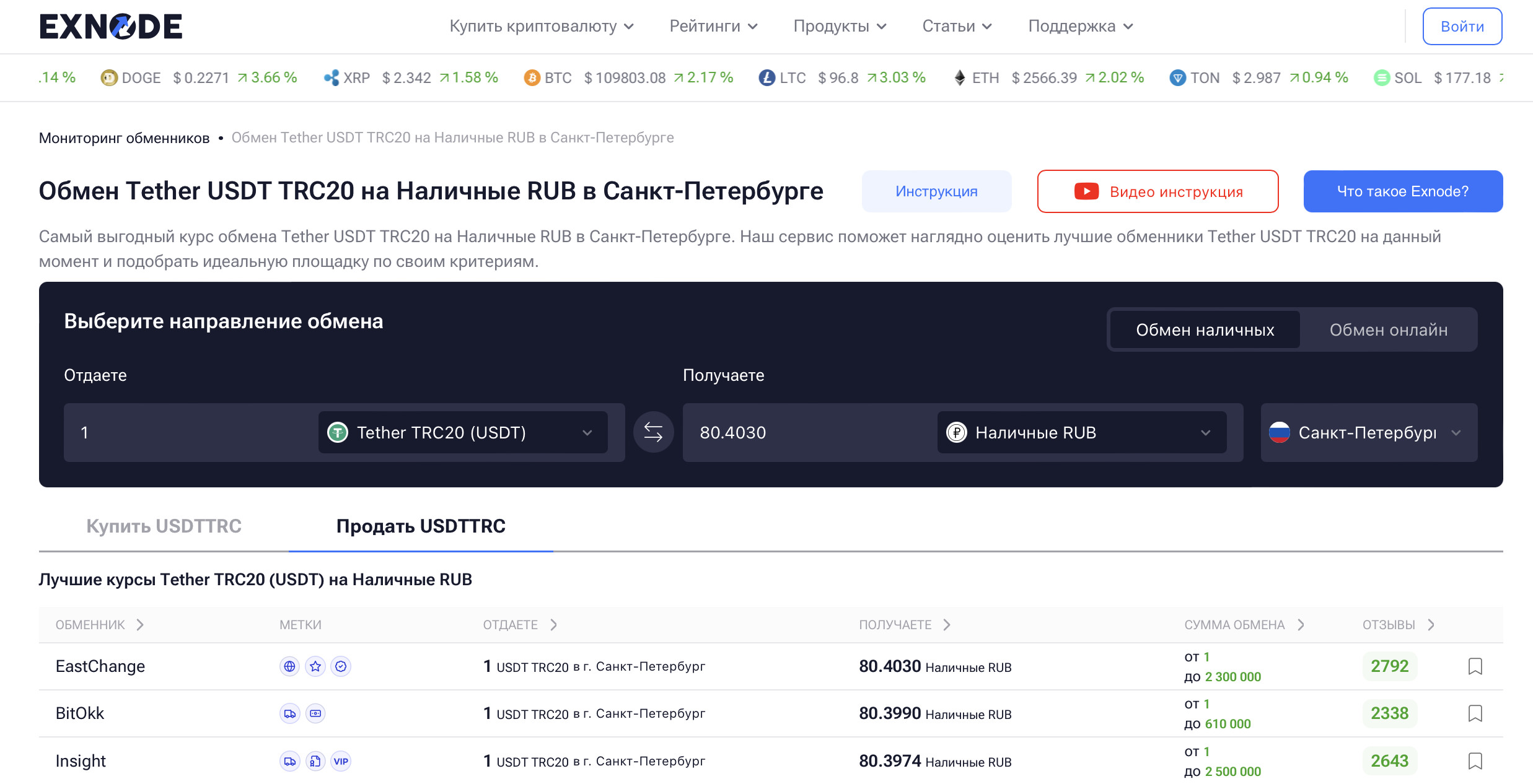 Первым делом необходимо подобрать надежный обменный пункт. Сделать это удобнее всего через мониторинг Exnode, где можно сравнить курсы, минимальные суммы и посмотреть реальные отзывы клиентов. Выберите тот сервис, который предлагает лучший курс и условия. Шаг 2. Оформление заявки На сайте выбранного обменника заполняется форма: вы указываете, сколько крипты хотите обменять, выбираете валюту (например, USDT или BTC) и вводите свои контактные данные (Telegram-ник). После этого с вами связывается менеджер для подтверждения деталей. Шаг 3. Подтверждение встречи Сотрудник обменника уточнит время и адрес офиса. Вы получите инструкции, куда подойти и как попасть внутрь — чаще всего понадобится документ для пропуска, но верификация личности не требуется. Шаг 4. Передача криптовалюты На месте вы передаёте криптовалюту на указанный кошелек. Сотрудник проверяет поступление средств и подготавливает рубли к выдаче. Шаг 5. Получение наличных После подтверждения транзакции вы получаете наличные рубли в офисе. Сделка завершается, и вы свободны — без скрытых комиссий и долгих ожиданий. Такой способ идеально подходит тем, кто хочет купить крипту за наличные в СПБ наоборот — быстро и удобно совершить обмен крипты на наличные в СПБ без риска. Сегодня обменять криптовалюту можно разными способами: через криптообменник, на бирже или с помощью p2p-сделок. У каждого из этих форматов есть свои плюсы и минусы, но если вы ищете надежность, скорость и контроль — выбор очевиден. Криптообменник — самый удобный способ для тех, кто ценит безопасность и личный подход. Преимущества: Недостатки: Криптобиржи — подходят тем, кто занимается трейдингом или часто меняет крипту. Преимущества: Недостатки: P2P-платформы — формат, при котором пользователи совершают сделки напрямую между собой. Преимущества: Недостатки: В Санкт-Петербурге крипта СПБ активно развивается, и всё больше людей выбирают именно крипто обменники для безопасной и быстрой конвертации. В отличие от других решений, здесь не нужно ждать подтверждений, регистрироваться или бояться заморозки средств. Особенно если вы хотите обменять крипту в СПБ за наличные быстро, анонимно и по хорошему курсу — обменники криптовалют в Санкт-Петербурге остаются лучшим выбором. Перед тем как обменять крипту в Санкт-Петербурге, важно правильно выбрать обменный пункт. Надежный криптообменник в СПБ — это не только гарантия безопасной сделки, но и возможность получить максимально выгодные условия. Ниже — ключевые критерии, на которые стоит ориентироваться. Выбирая криптообменник в Санкт-Петербурге, всегда ориентируйтесь на собственные цели, сумму и удобство расположения. Найти надежный и выгодный криптообменник в СПБ — задача не из лёгких, особенно когда на рынке десятки предложений. Однако, если подойти к выбору осознанно, ориентируясь на реальные отзывы, условия сделок и курсы, можно не только сэкономить, но и обеспечить себе безопасность и комфорт. Среди лучших обменников криптовалют в Санкт-Петербурге в 2025 году уверенно лидируют Insight, BitOkk, EastChange и KriptoObmennik. Эти сервисы предлагают отличные условия, быстрое обслуживание и прозрачные курсы без скрытых комиссий. Если вы хотите обменять крипту СПБ без лишнего риска — выбирайте именно их. Для удобства сравнения условий и актуальных курсов используйте мониторинг Exnode — это н
