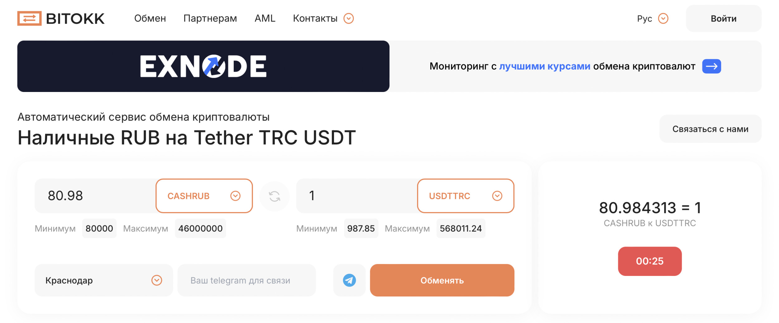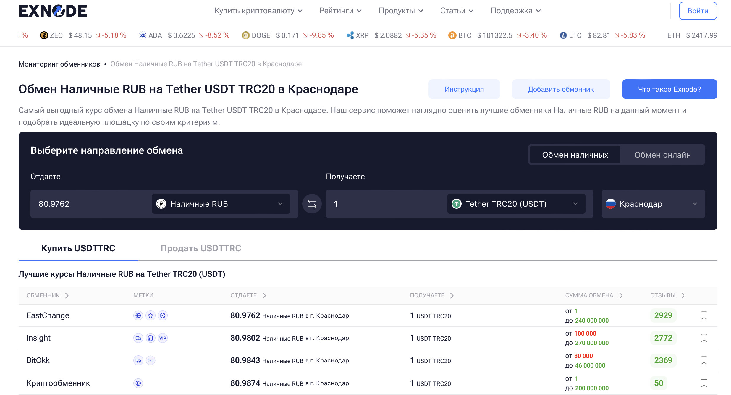 Первым делом стоит определиться, где вы хотите провести обмен. Чтобы не переплачивать и не рисковать, лучше всего использовать специализированные мониторинги. Один из самых удобных — Exnode. Сервис собирает актуальные курсы, показывает реальные отзывы клиентов и отмечает только проверенные площадки. ✅ Шаг 2: Оформите заявку на сайте обменника После того как вы выбрали обменник, переходите на его сайт. Там нужно заполнить форму заявки: ✅ Шаг 3: Подтвердите детали сделки с менеджером Представитель обменника свяжется с вами в Telegram и уточнит ключевые моменты: Будьте внимательны: хороший менеджер всегда отвечает оперативно и вежливо — это ещё один знак качественного сервиса. ✅ Шаг 4: Приезжайте в офис и проводите обмен В назначенное время вы приходите в офис. Сделка проходит «лицом к лицу»: Весь процесс обычно занимает 10–15 минут. Выбор обменника — это не только вопрос доверия, но и экономии. Разница в курсе между разными площадками может составлять от 1% до 5%, а при крупных суммах — это уже ощутимая разница. Поэтому, если вы хотите найти обменник криптовалют с лучшим курсом, важно учитывать несколько ключевых критериев. 🔍 1. Актуальность и прозрачность курса Самое очевидное — сравнить предлагаемые курсы. Но здесь важно не попасться на уловки, где «на первый взгляд» курс хороший, а по факту скрыты комиссии. Чтобы избежать этого, рекомендуем использовать Exnode, а именно его новый инструмент Exnode Trading. Этот раздел позволяет отслеживать рыночные курсы более 100 криптовалют в реальном времени, чтобы вы могли понять, насколько предложение конкретного обменника действительно выгодное. 🔐 2. Безопасность и конфиденциальность Проверяйте, в каких условиях проходит сделка. У хороших обменников — охраняемые офисы, видеонаблюдение и контроль доступа. 👥 3. Репутация и отзывы Ищите площадки, которые входят в рейтинг лучших криптообменников на популярных мониторингах. Обратите внимание на комментарии пользователей: жалобы на задержки, «плавающие курсы» или невежливую поддержку — это тревожные звоночки. 📞 4. Скорость отклика и удобство связи Надёжный обменник — это тот, кто ответит в Telegram в течение 2–5 минут, уточнит все детали и быстро оформит заявку. Медленная или некомпетентная поддержка может дорого обойтись, особенно если курс «прыгает». В 2025 году, несмотря на развитие онлайн-платформ и P2P-сервисов, именно обменники остаются самым надёжным, удобным и безопасным способом обмена криптовалюты. 💡 Преимущества обменников: ⚠️ Недостатки, с которыми стоит считаться: Если вы хотите быть уверены в выборе, пользуйтесь Exnode — это не просто мониторинг, а полноценный инструмент для анализа и подбора сервиса. Благодаря ему вы можете сравнить предложения в реальном времени, прочитать отзывы, посмотреть рейтинги и выбрать действительно лучшие обменники криптовалюты с точки зрения репутации, курсов и удобства. В числе лучших криптообменников 2025 года с высокой скоростью и уровнем доверия выделяются: Эти сервисы входят в рейтинг лучших криптообменников и ежедневно подтверждают свою репутацию реальными отзывами пользователей.