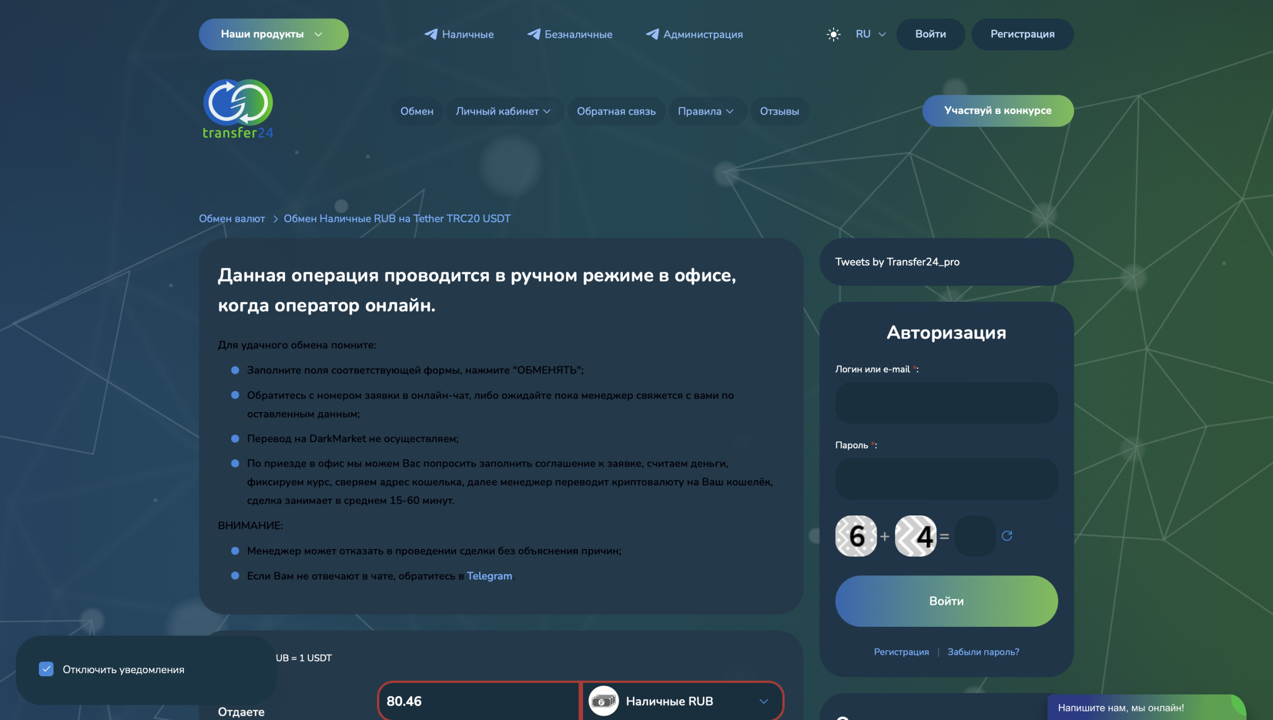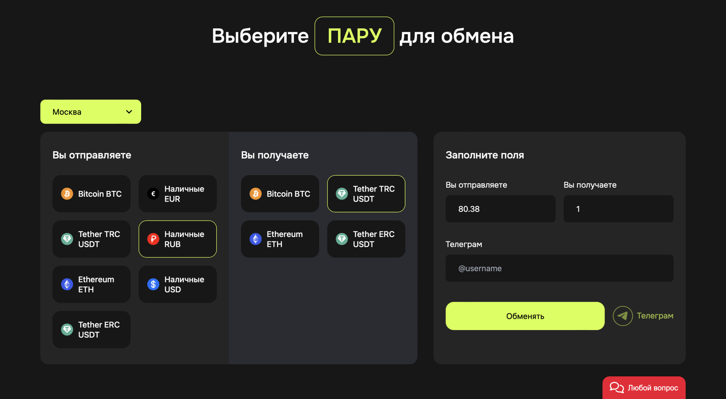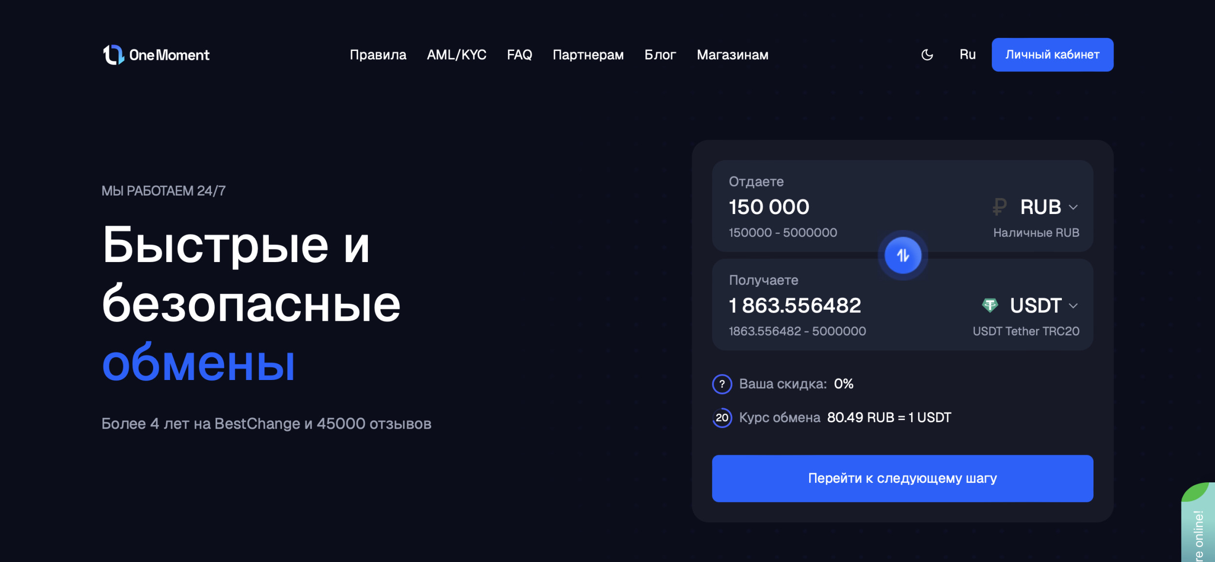 Универсальный обменник с удобным интерфейсом, быстрым обслуживанием и отличной репутацией. Подходит как для новичков, так и для опытных клиентов, желающих быстро купить USDT в Москве с минимальными рисками.