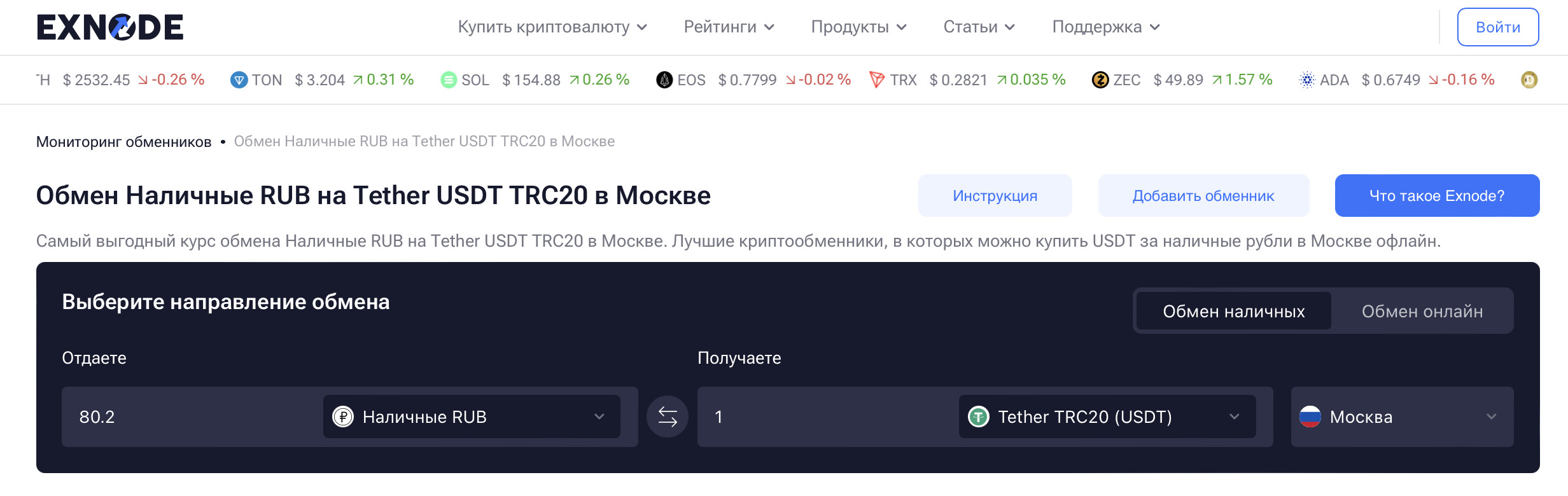 Первый и самый важный шаг — это выбор надёжного обменника. Чтобы не тратить время на сомнительные сайты, сразу переходите на Exnode — крупнейший мониторинг криптообменников. Здесь вы найдёте только проверенные сервисы, актуальные курсы, реальные отзывы и сможете сравнить предложения по направлению RUB → USDT. 🔹 Шаг 2: Оформление заявки на сайте обменника После выбора подходящего обменника переходите на его сайт. Там вы заполняете заявку: 🔹 Шаг 3: Связь с менеджером Через несколько минут с вами свяжется менеджер через Telegram. Он подтвердит детали заявки, сообщит точный адрес офиса и предложит удобное время для визита. Также вы сможете задать любые вопросы — как по курсу, так и по безопасности сделки. 🔹 Шаг 4: Визит в офис обменника Приходите в назначенное время в офис, указанный менеджером. Процедура простая: Все операции проходят конфиденциально и под контролем безопасности. 🔹 Шаг 5: Проверка зачисления и завершение сделки После перевода средств убедитесь, что токены поступили на ваш кошелёк. Только после этого завершайте сделку. Таким образом, купить USDT в Москве можно быстро, безопасно и без головной боли. Главное — выбрать проверенный офисный обменник и следовать простым шагам. Пока одни новички ломают голову над регистрацией на бирже, верификацией личности и комиссиями, опытные пользователи просто покупают USDT в Москве за наличные — быстро, конфиденциально и без лишней волокиты. Криптообменники — это не просто альтернатива биржам и P2P-платформам, а самый надёжный способ для реальной сделки в условиях российского рынка 2025 года. ✅ Почему это выгодно? 1. Анонимность сделки В отличие от бирж, где обязательно требуется KYC (верификация с паспортом, селфи и кучей данных), при визите в офис купить USDT за наличные в Москве можно без раскрытия личности. Всё, что нужно — Telegram-ник и криптокошелёк. 2. Никаких комиссий Обменники не взимают скрытые сборы — курс уже финальный. Это особенно актуально, если вам интересна покупка USDT в Москве с максимально выгодным курсом. 3. Надёжность и безопасность Все сделки проходят в охраняемых офисах, часто в Москва-Сити или деловых кварталах. Персонал проверен, а условия строго регламентированы. Это безопаснее, чем передача денег «из рук в руки» через P2P. 4. Быстро и без регистрации Процедура занимает не более 15–20 минут. Не нужно создавать аккаунт, ждать подтверждения документов или бояться, что вам «не скинут» токены после оплаты. Здесь всё — вживую и под контролем. 5. Крупные суммы — легко Офисные обменники — практически единственный способ купить USDT за наличные рубли в Москве, если речь идёт о значительных суммах. Биржи и P2P часто ограничивают лимиты и требуют дополнительных проверок. Если вам важно сохранить конфиденциальность, исключить комиссии и не зависеть от нестабильной онлайн-платформы — купить USDT за наличные в Москве через офис обменника — самый разумный выбор. Именно такой формат предпочитает большинство практичных криптовалютных пользователей в 2025 году. Даже если вы знаете, где купить USDT в Москве, это ещё не значит, что сделка будет выгодной. Выбор обменника — ключевой этап, от которого зависит не только курс, но и безопасность, скорость и комфорт самой операции. Ниже — список критериев, на которые стоит обратить внимание перед тем как оставить заявку. 🔍 1. Репутация и отзывы Всегда изучайте от