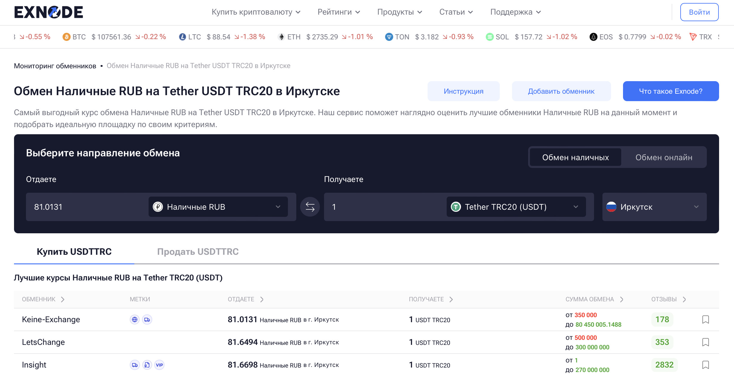 А чтобы не рыскать по форумам в поисках актуальных курсов, советуем пользоваться Exnode — это удобный мониторинг криптообменников, который подскажет, где выгоднее всего обменять ваш USDT, BTC, ETH и не только. С его помощью вы за пару кликов найдете подходящий обменник криптовалют в Иркутске и не попадете на подставу.