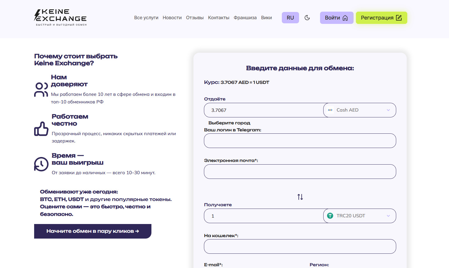 1. Keine-Exchange Keine-Exchange — надёжный криптообменник Красноярска, который давно работает на рынке и имеет устойчивую репутацию среди местных пользователей. Сервис подчёркивает безопасные сделки, фиксированный курс и чёткую организацию работы. Преимущества: Надежный криптообменник Красноярска, который работает давно на рынке и имеет высокую репутацию среди местных трейдеров. Преимущества: Универсальный обменник криптовалют в Красноярске, ориентированный на работу с крупными суммами. Поддерживает обмен BTC, ETH, USDT. Преимущества: Филиал популярного московского обменника. Работает по предварительной записи. Один из самых известных криптообменников Красноярска среди опытных клиентов. Преимущества: Современный обменный пункт с быстрым обслуживанием и отличной репутацией. Отлично подходит для тех, кто хочет обменять крипту в Красноярске без лишней волокиты. Преимущества: Проверенный обменник крипты Красноярска, с большими резервами валют. Подходит для крупных сделок Преимущества: Если вы хотите обменять крипту в Красноярске без риска и с минимальными комиссиями, следуйте простой инструкции. Ниже — пять шагов, которые помогут вам провести сделку с USDT или биткоинами в Красноярске. Шаг 1. Найдите проверенный обменник через мониторинг Первый и самый важный шаг — выбор надёжного сервиса. Чтобы не нарваться на мошенников, используйте сервисы мониторинга, например, Exnode. На нём вы найдёте актуальные курсы для обмена USDT в Красноярске, увидите доступные резервы, а также прочитаете реальные отзывы пользователей. Шаг 2. Оставьте заявку на обмен на сайте обменника После выбора подходящего пункта, переходите на его сайт. Заполните форму заявки, указав: Шаг 3. Уточнение деталей через менеджера В течение нескольких минут с вами выйдет на связь менеджер — через Telegram. Он подтвердит ваш запрос, согласует точную сумму, время и адрес встречи в офисе обменника в Красноярске. Если у вас есть вопросы по курсу или лимитам — самое время их задать. Шаг 4. Посещение офиса и проведение сделки Приходите в офис в указанное время. На месте вы подтверждаете условия, переводите USDT или биткоины на криптокошелёк обменника. После подтверждения транзакции, вам выдают рубли наличными. Надёжные сервисы работают в охраняемых бизнес-центрах и предлагают комфортную обстановку. Шаг 5. Проверка и завершение После получения денег убедитесь, что сумма соответствует оговорённой. На этом всё — вы успешно смогли обменять крипту в Красноярске быстро и безопасно. Следуя этим шагам, вы минимизируете риски и обеспечите себе выгодный обмен USDT и битоина в Красноярске. Надёжные сервисы ценят клиентов, поэтому чем точнее вы соблюдаете процесс — тем комфортнее проходит сделка. Многие начинающие пользователи задаются вопросом: где лучше провести обмен криптовалюты в Красноярске— на криптобирже или через обменник? В 2025 году всё больше людей выбирают именно второй вариант, и на это есть весомые причины. 1. Отсутствие KYC В отличие от бирж, которые требуют верификацию личности, загрузку документов и длительное подтверждение аккаунта, криптообменники в Красноярске позволяют совершать обмены без передачи лишних личных данных. Это особенно ценно для тех, кто хочет сохранить конфиденциальность своих операций. 2. Быстрота сделки На бирже обмен может занять часы или даже сутки — особенно ес