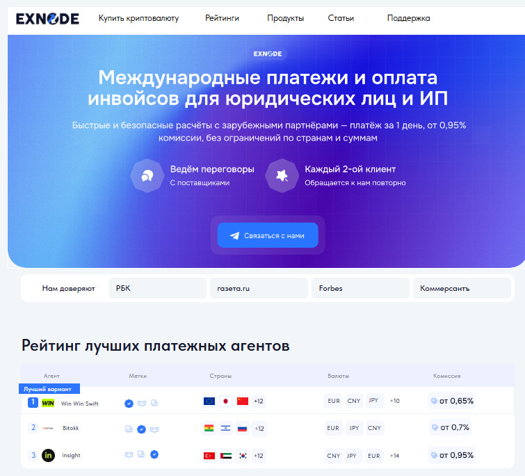 Win-Win Swift Компания, которая успешно работает с международными транзакциями, включая оплату инвойса в Японию. Win-Win Swift предоставляет надежные и быстрые переводы для бизнеса, работающего с иностранными поставщиками. Особенности: Insight Insight — это платформа для международных платежей, которая предоставляет доступ к широкому выбору валют в том числе японской йене. Особенности: BitOkk BitOkk — это международный сервис, который предлагает быстрые и безопасные переводы средств, включая оплату инвойса в Японию за автомобиль или другие товары. Особенности: Если вы решаете использовать платежного агента, чтобы совершить инвойс-перевод в Японию, важно знать, как правильно провести его. Рассмотрим основные этапы этого процесса. Шаг 1. Выбор платежного агента Первый этап — это выбор подходящей платформы для осуществления международных платежей, которая работает с юридическими лицами. Используйте платформы мониторинга для выбора надежного агента для перевода инвойса в Японию. Шаг 2. Получение инвойса от поставщика После того как вы договоритесь с поставщиком, например, за автомобиль или другую продукцию в Японии, он предоставит вам инвойс для оплаты. Платеж будет произведен через платежного агента, а не напрямую вашей компанией. Шаг 3. Оформление счета у агента Как только инвойс от японского поставщика получен, платежный агент рассчитает сумму в рублях, учитывая комиссию и затраты на валютную конвертацию. Затем он выставит вам счет, который необходимо оплатить. Шаг 4. Перевод средств агенту Вы оплачиваете выставленный счет на расчетный счет агента в рублях. Поскольку все операции происходят внутри страны, валютный контроль не применяется. Шаг 5. Окончательный перевод После получения вашего платежа платежный агент переводит средства на счет японского поставщика. Все документы предоставляются вам для отчетности. В 2025 году у бизнеса есть два основных способа провести международные платежи. Рассмотрим их подробнее и сделаем вывод о преимуществах каждого. Платежные агенты становятся все более популярными благодаря доступности и выгодным условиям. Да, сейчас действует множество нелегальных компаний, но чтобы выбрать безопасный сервис, можно использовать Exnode Инвойс. Преимущества: Традиционный способ перевода через банки еще используется, но часто он сопряжен с длительными сроками и высокими комиссиями. Поэтому бизнес в РФ чаще выбирает платформы международных переводов для оплаты инвойса в Японию. Минусы: Оплата инвойса в Японию может быть сопряжена с рядом проблем, которые могут затруднить процесс перевода средств. Важно понимать, какие трудности могут возникнуть, чтобы заранее подготовиться к их решению. Рассмотрим основные проблемы, с которыми могут столкнуться компании при международных платежах в Японию, и пути их устранения. Проблема: Задержки при международных переводах — это довольно частая проблема. Переводы через банки могут занимать от нескольких дней до недели, что может затруднить соблюдение сроков оплаты инвойса в Японию. Как решить: Для ускорения процесса можно: Проблема: Ошибки в данных получателя (например, неправильный номер счета или адрес) могут привести к возврату средств или блокировке перевода. При оплате инвойса в Японию требуется точное соблюдение всех реквизитов. Как решить: Чтобы избежать ошибок: Проблема: 